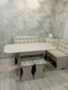 Состоит из углового кухонного дивана, обеденного стола и двух мягких табуретов. Под сиденьем находятся ящики для хранения. Универсальная сборка - право/лево.