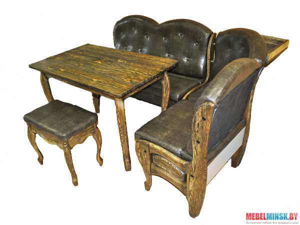 Роскошная обеденная группа из натурального дерева состоит из углового диванчика, стола и банкетки. Обивка: искусственная кожа. Обеденный гарнитур выполнен в классическом стиле.