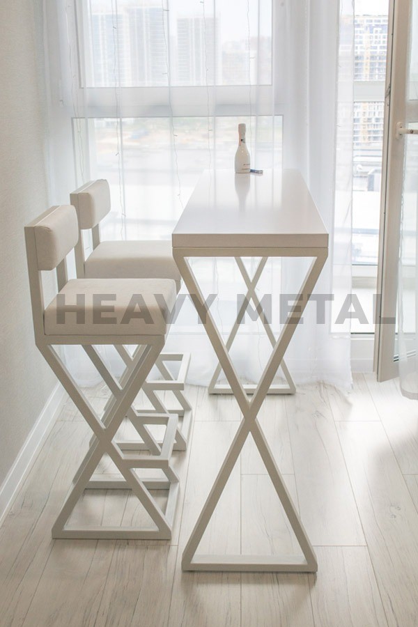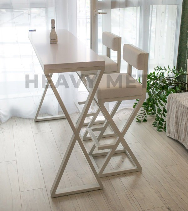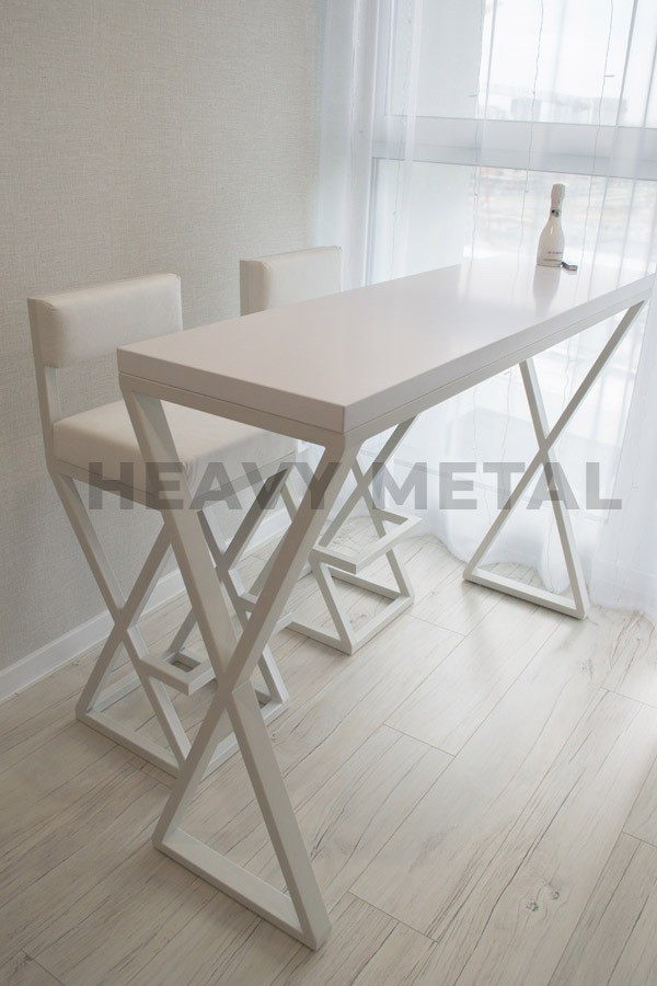 Барный стол в стиле лофт – “Ксандрия” в сочетании со стульями “Кобейн” будут отлично смотреться на кухне, балконе, гостиной комнате и кафе. Схожие крестообразные основания изделий делают их максимально подходящими друг другу.