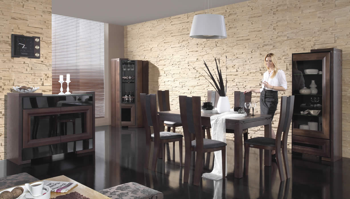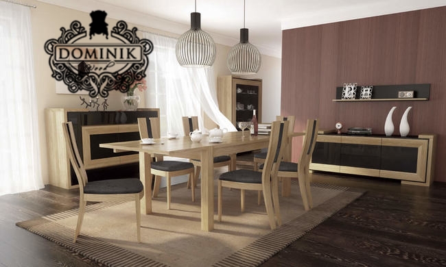 Коллекция "Корино" предназначена для гостинной, столовой и спальни. Модульная мебель с динамичными, геометрическими формами и контрастными материалами доступная в следующих цветовых гаммах: натуральный дуб - черный, а также орех - черный, которые сопровождает стекло и обивка.