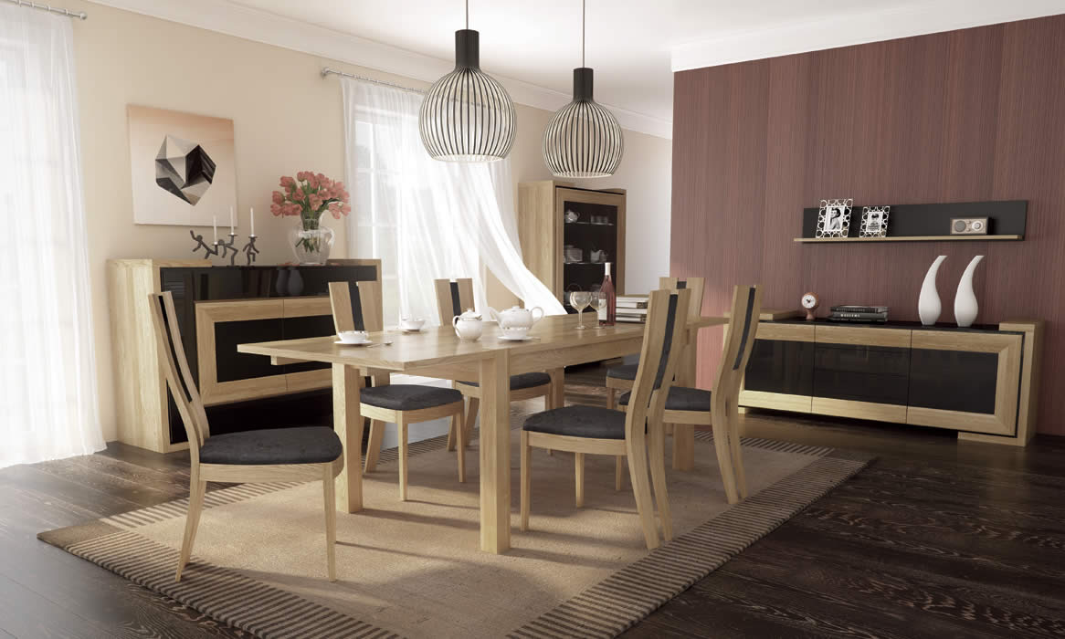 Уютная обеденная группа в изысканном исполенении, при котором максимально использованы натуральная древесина и шпон в естественных цветах. Кухонный стол на массивных ножках с раздвижной столешницей легко уместит большую семью или компанию друзей. Стулья имеют изящную спинку с вертикальной мягкой вставкой, позволяющей принять удобную позу при глубокой посадке. Обивка сиденья и спинки темно-серого оттенка.