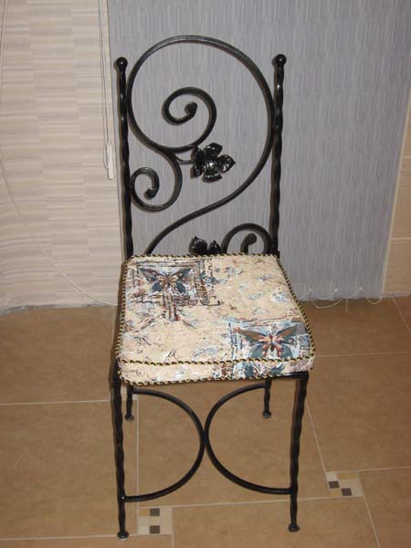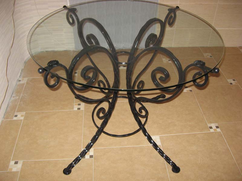 Обеденная группа включает стол со столешницей круглой формы. Стулья набора имеют высокую спинку, которая декорирована металлическими цветами. Столешница стола выполнена из прозрачного стекла.