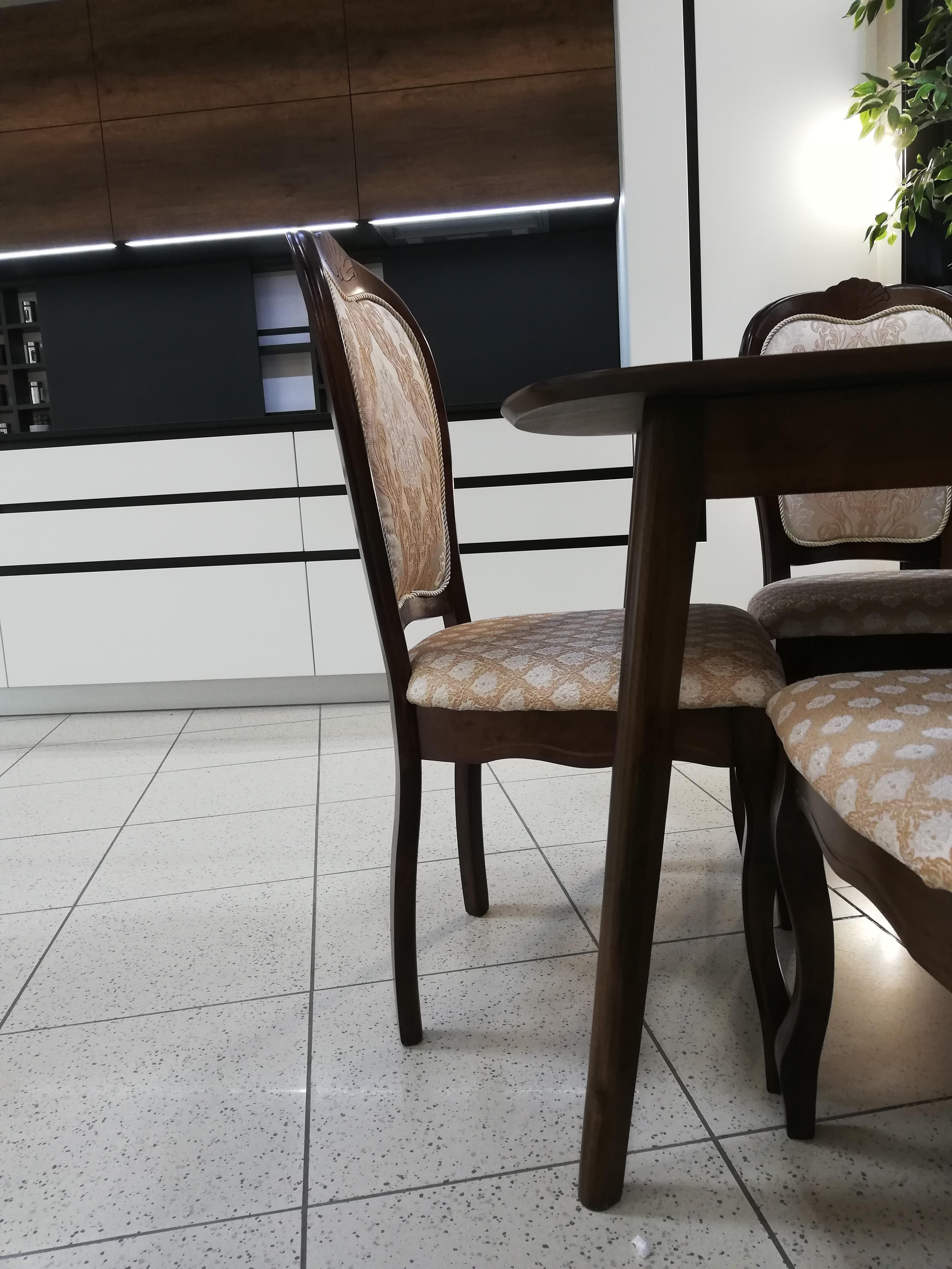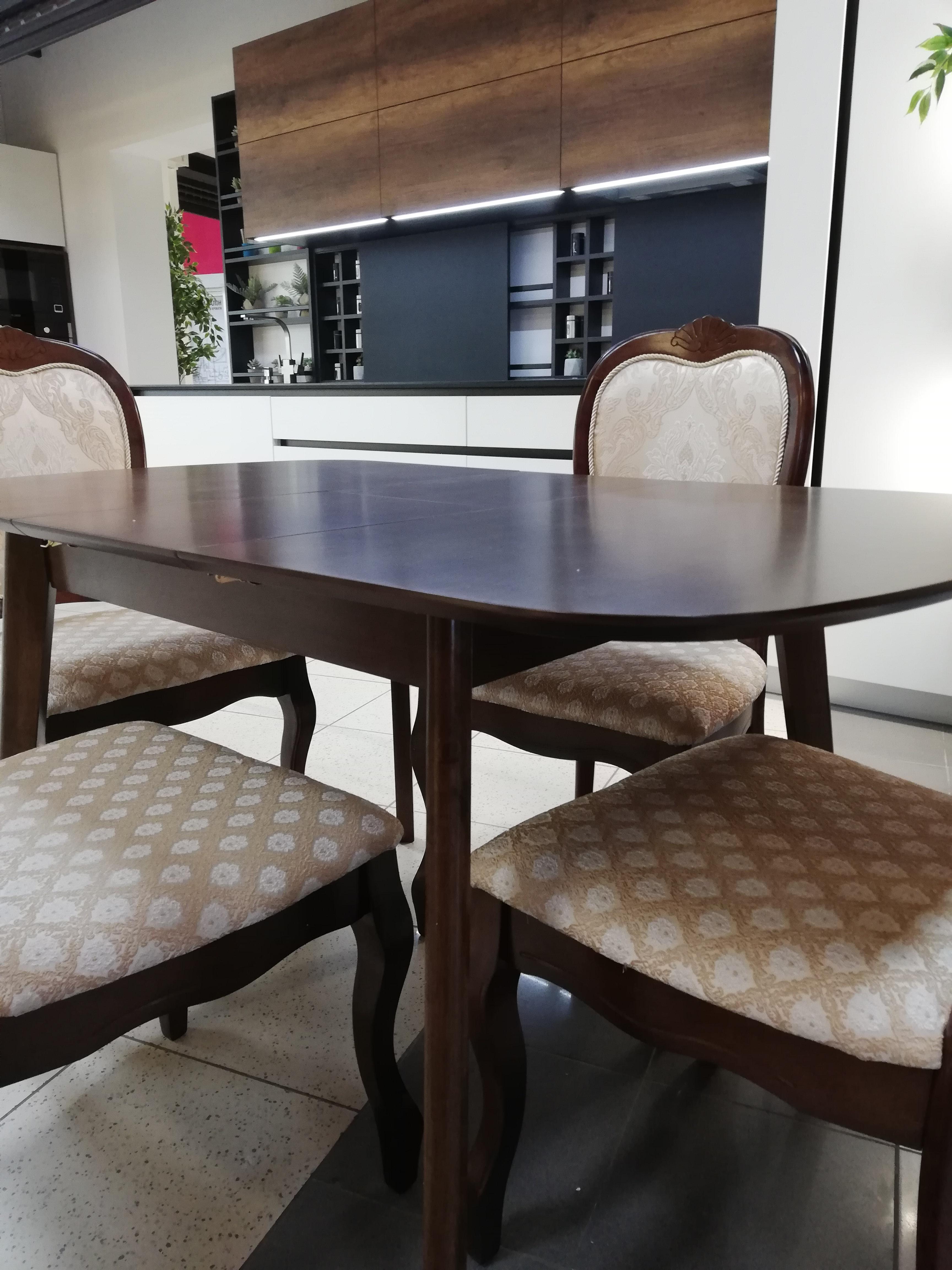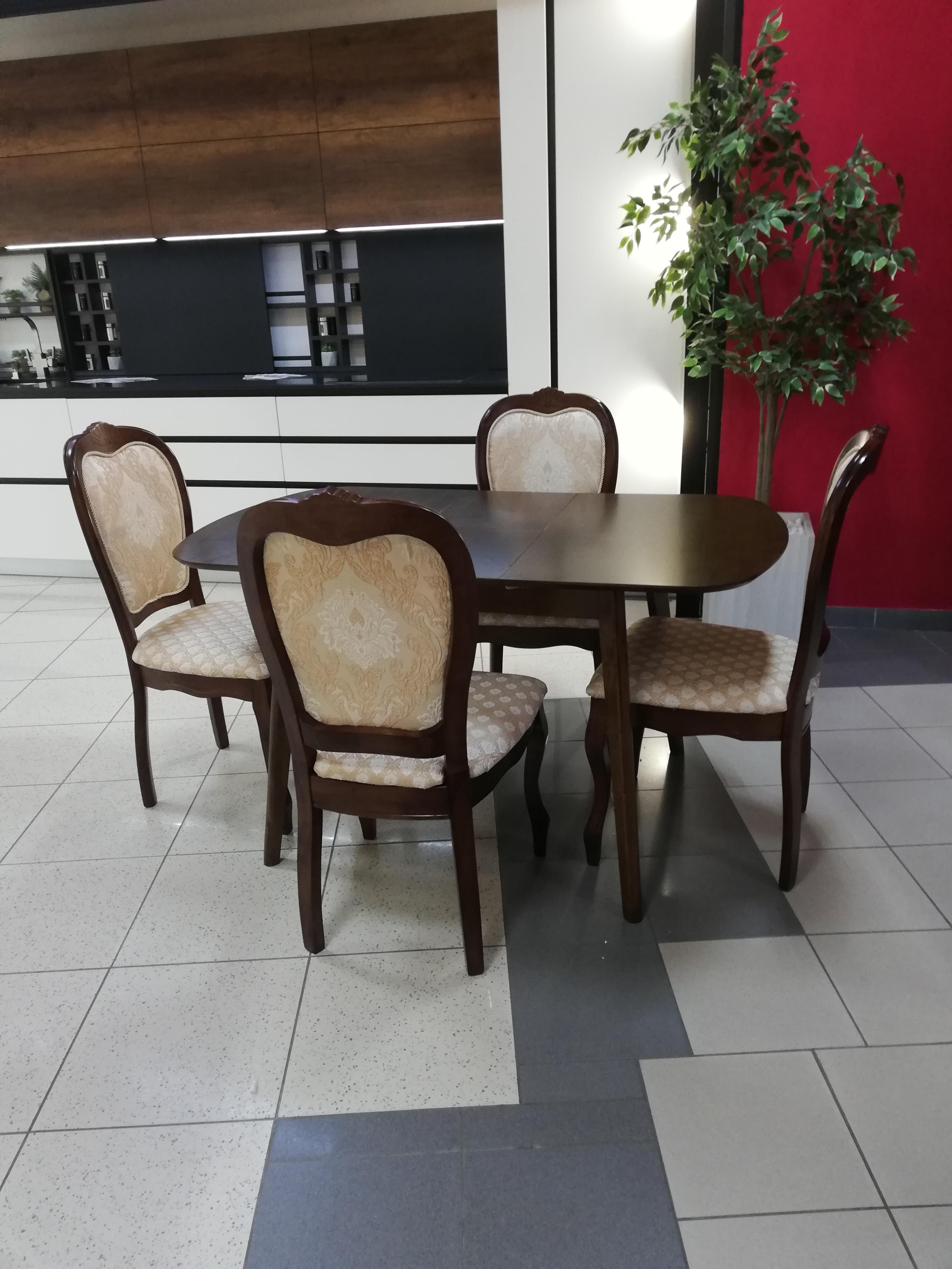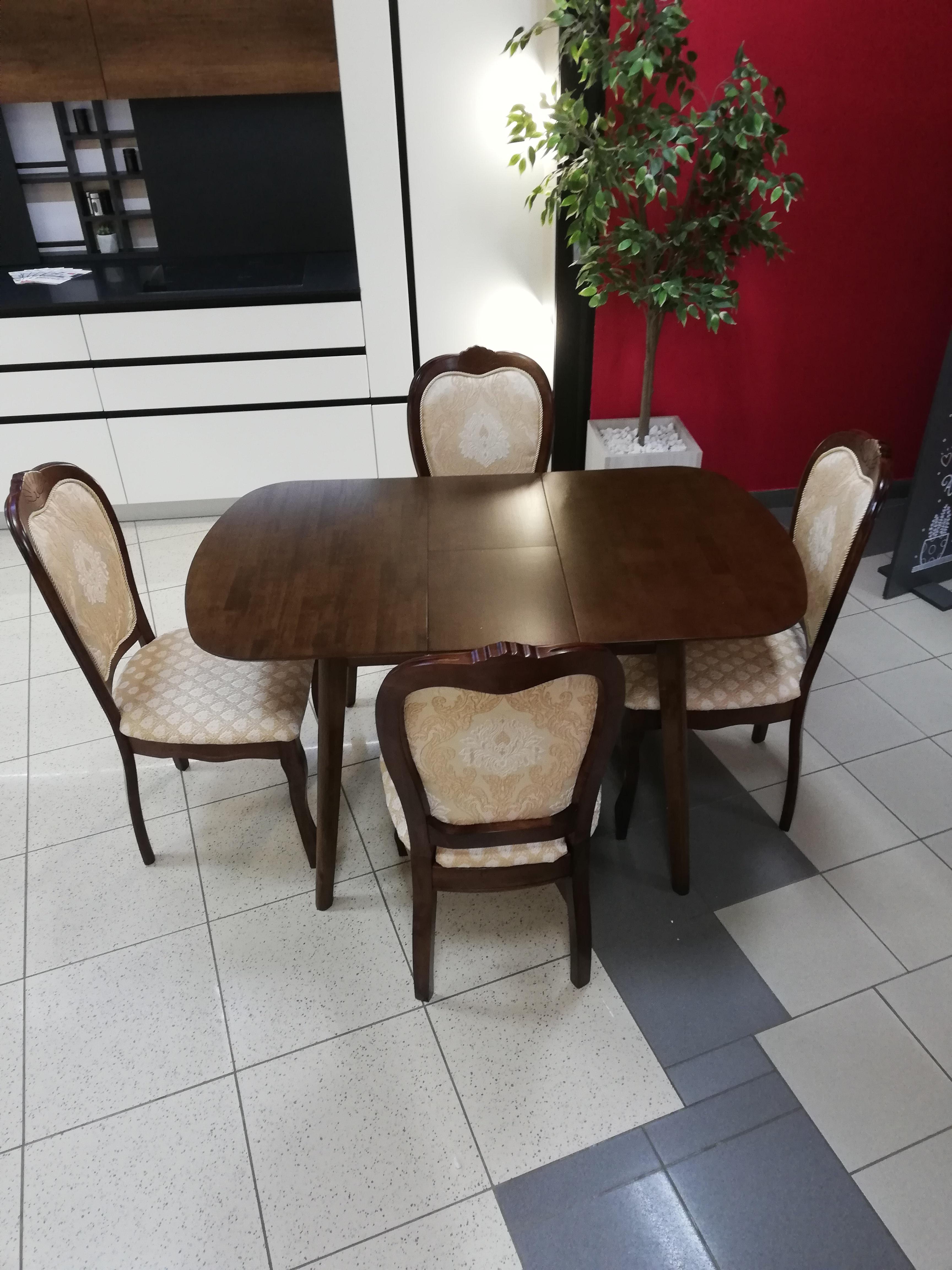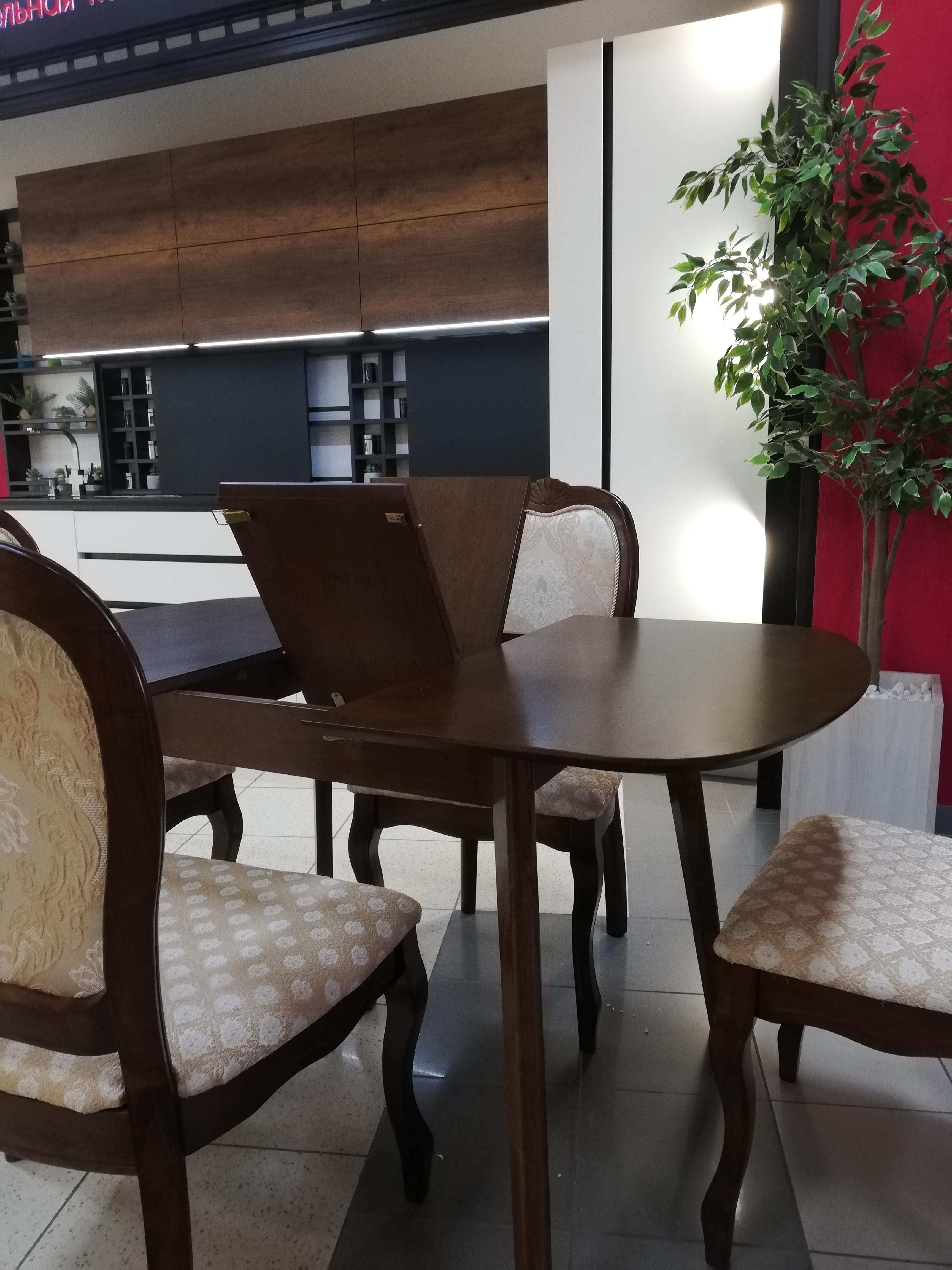 Набор включает в себя обеденный стол и 4 табурета. Разные цвета обивки.