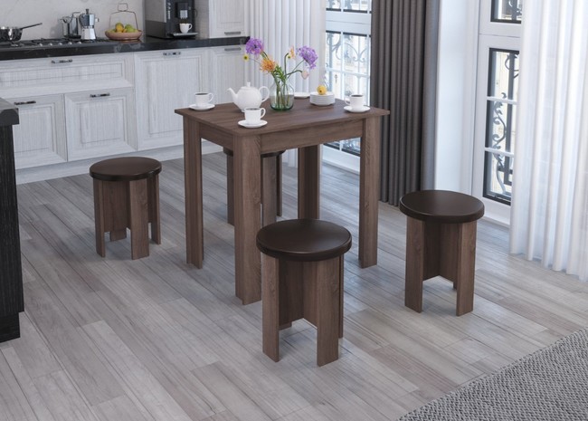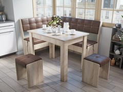 Состоит из углового кухонного дивана, обеденного стола и двух мягких табуретов. Под сиденьем находятся ящики для хранения. Универсальная сборка - право/лево.