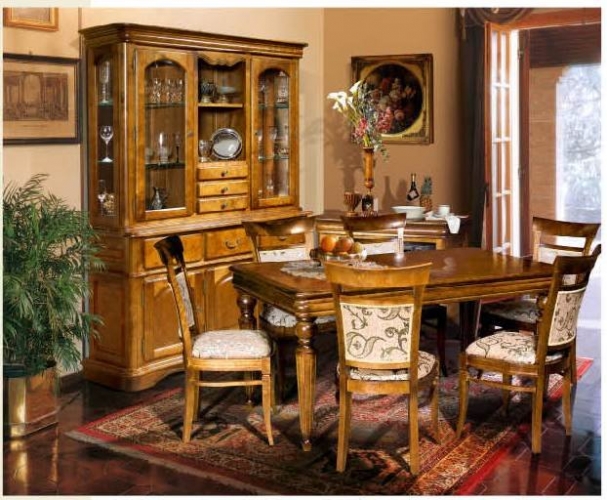 Столовый набор мебели для кухни из натурального массива дерева в стиле европейской классики с элементами модерна. В компелкт входит сервант с остекленными витринами, стол с резными ножками и шесть стульев со смягченными спинками и сиденьями.