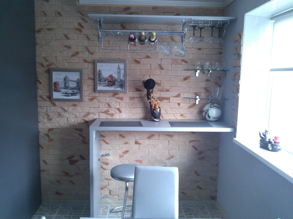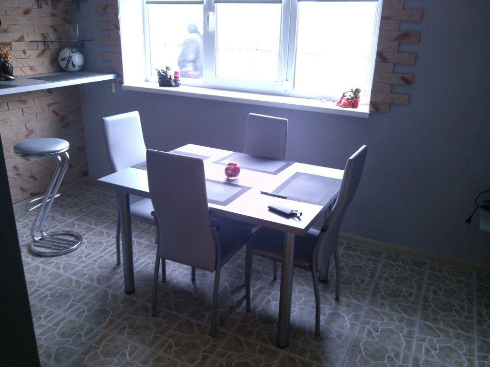 Обеденная группа может состоять из стола, стойки, обычных и барных стульев в необходимом вам количестве. Она выполнена в современном стиле и станет украшением небольшой кухни или столовой. Барная стойка надёжно крепится к стене специальными креплениями.