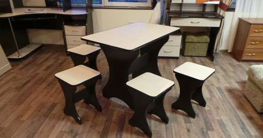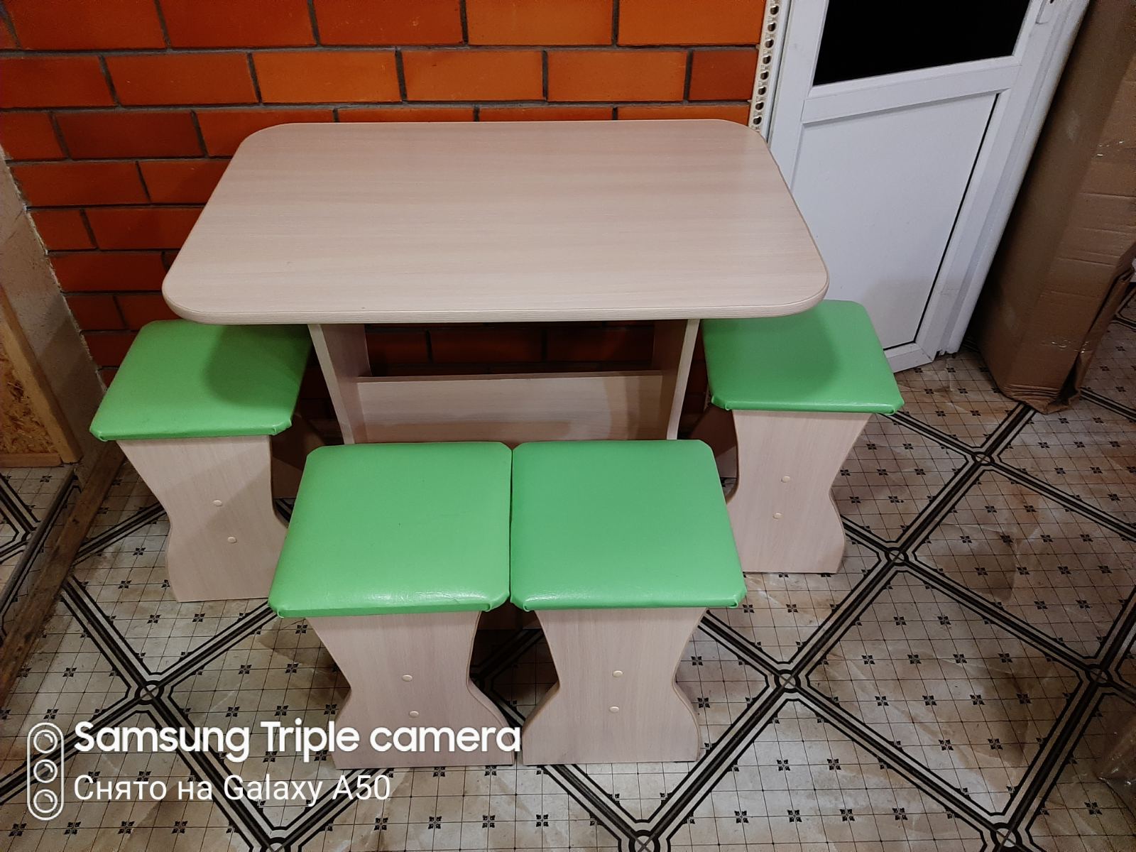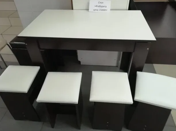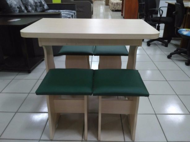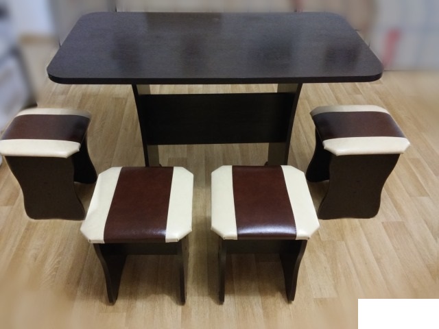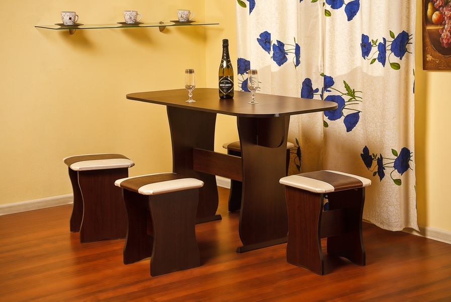 Состоит из углового кухонного дивана, обеденного стола и двух мягких табуретов. Под сиденьем находятся ящики для хранения. Универсальная сборка - право/лево.