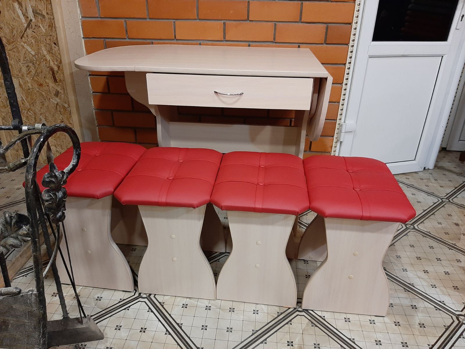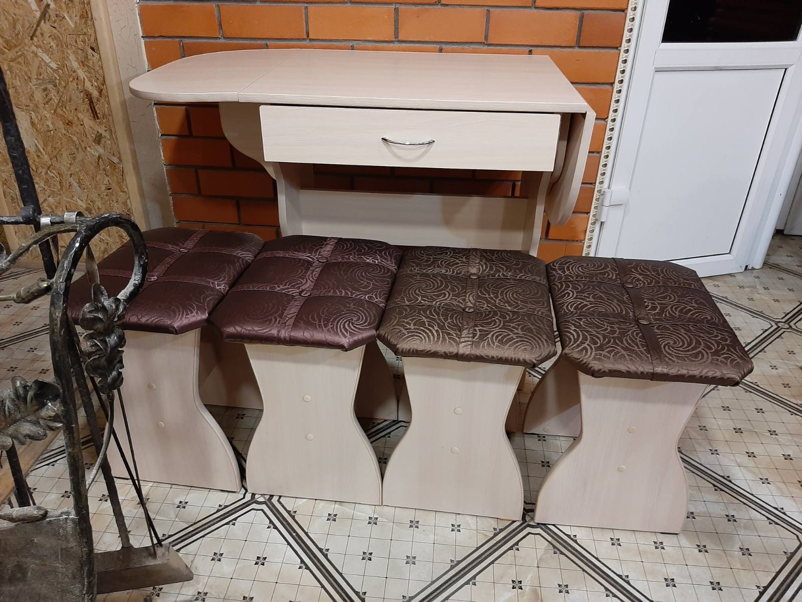 Компактная модель для небольшой по площади кухни. Угловая скамья, стол и два табурета.