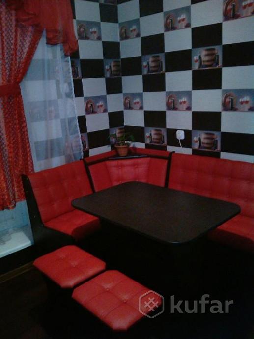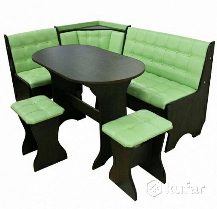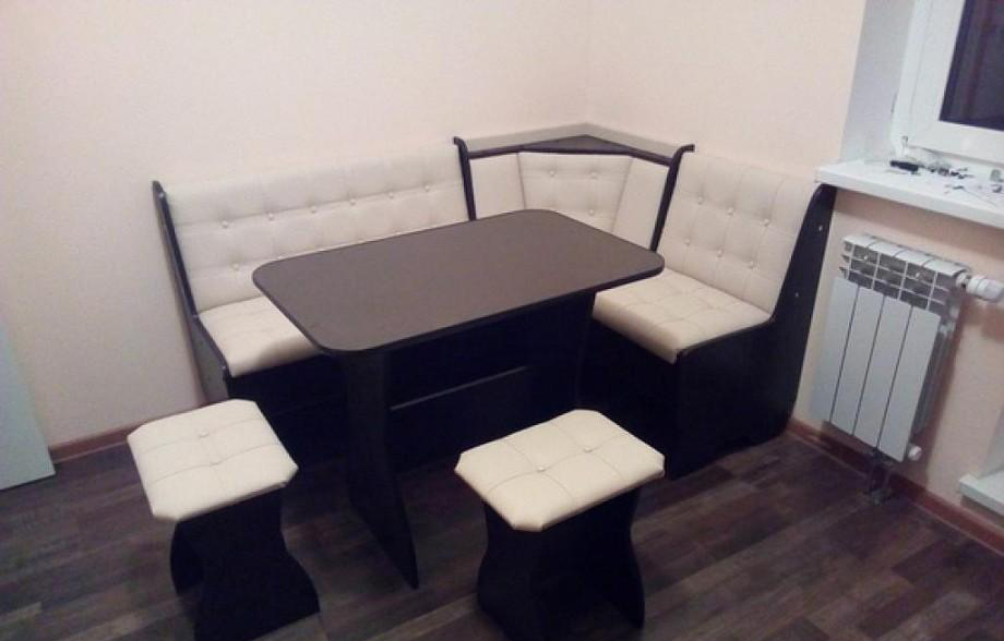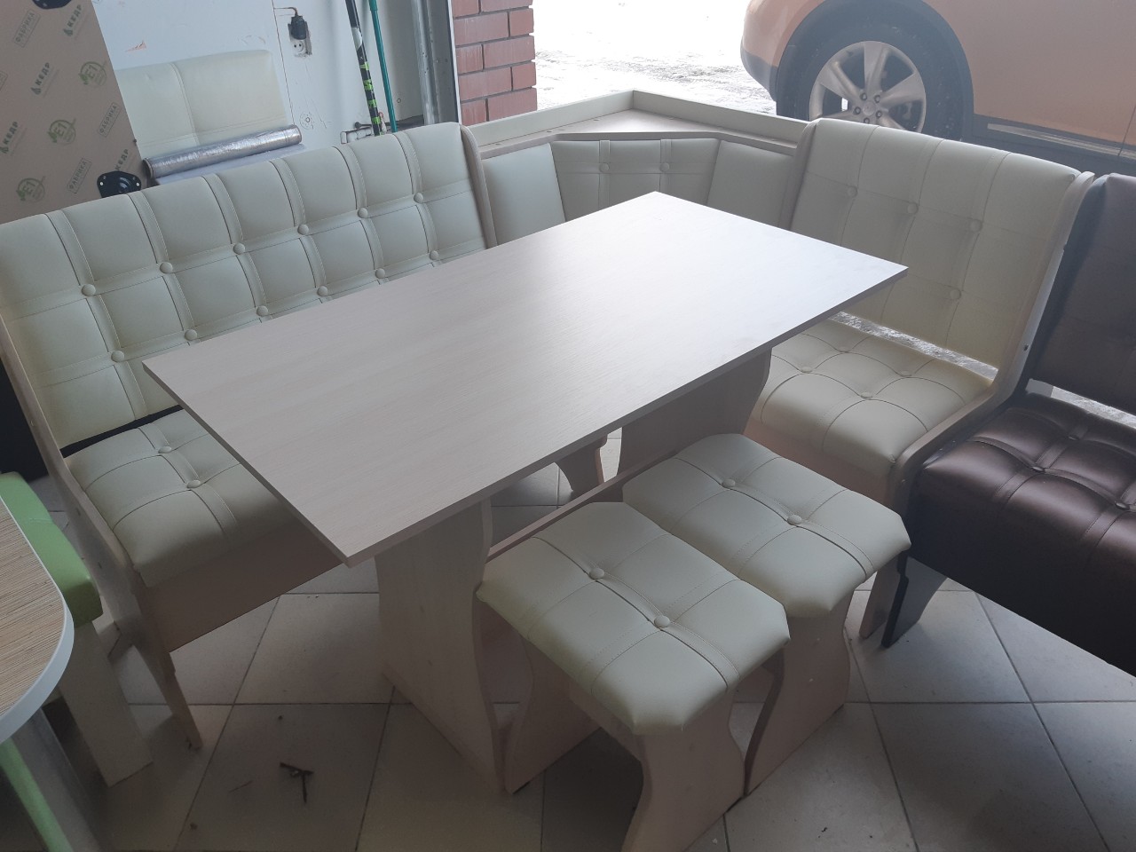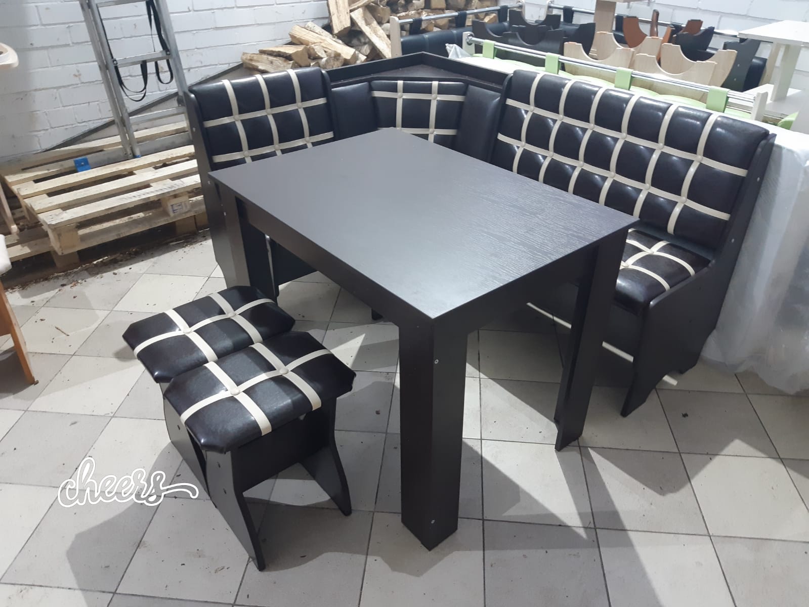 В набор входит угловая скамья, стол и два табурета. Цвет и размер на выбор.