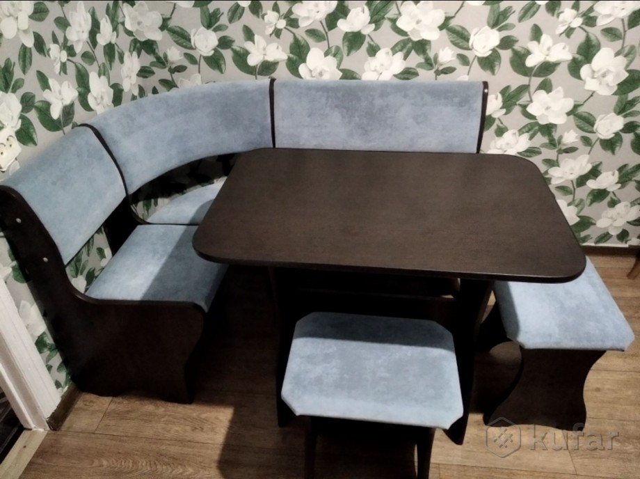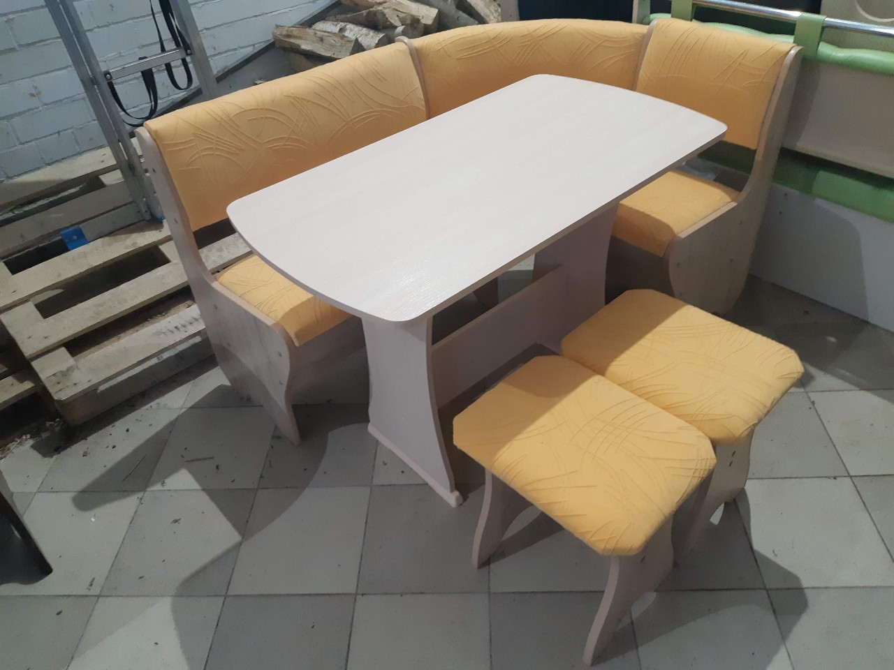 Компактная модель для небольшой по площади кухни. Угловая скамья, стол и два табурета.