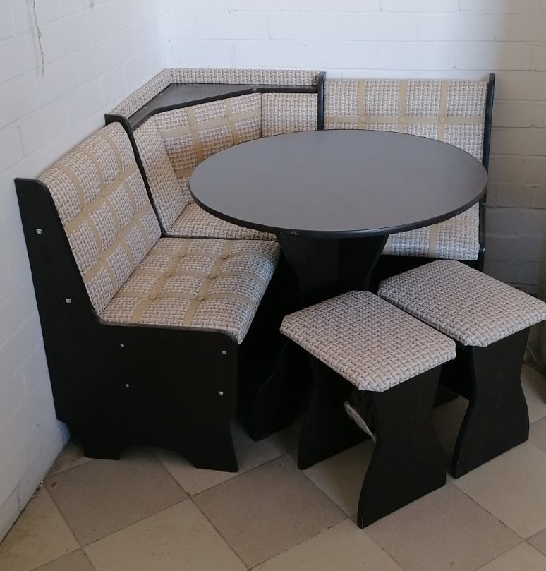 В набор входит угловая скамья, стол и два табурета. Множество вариантов цветов. Выбор материала обивки. Безопасные конструкции со скругленными углами.
