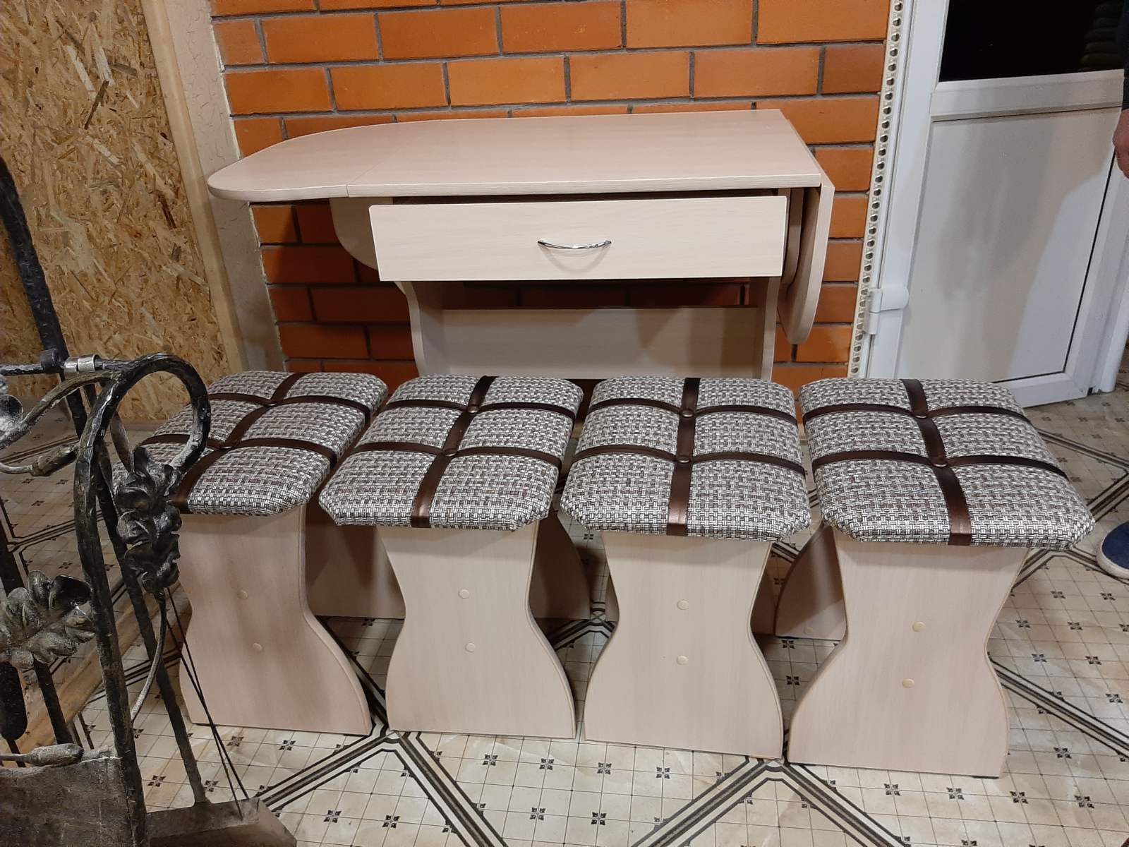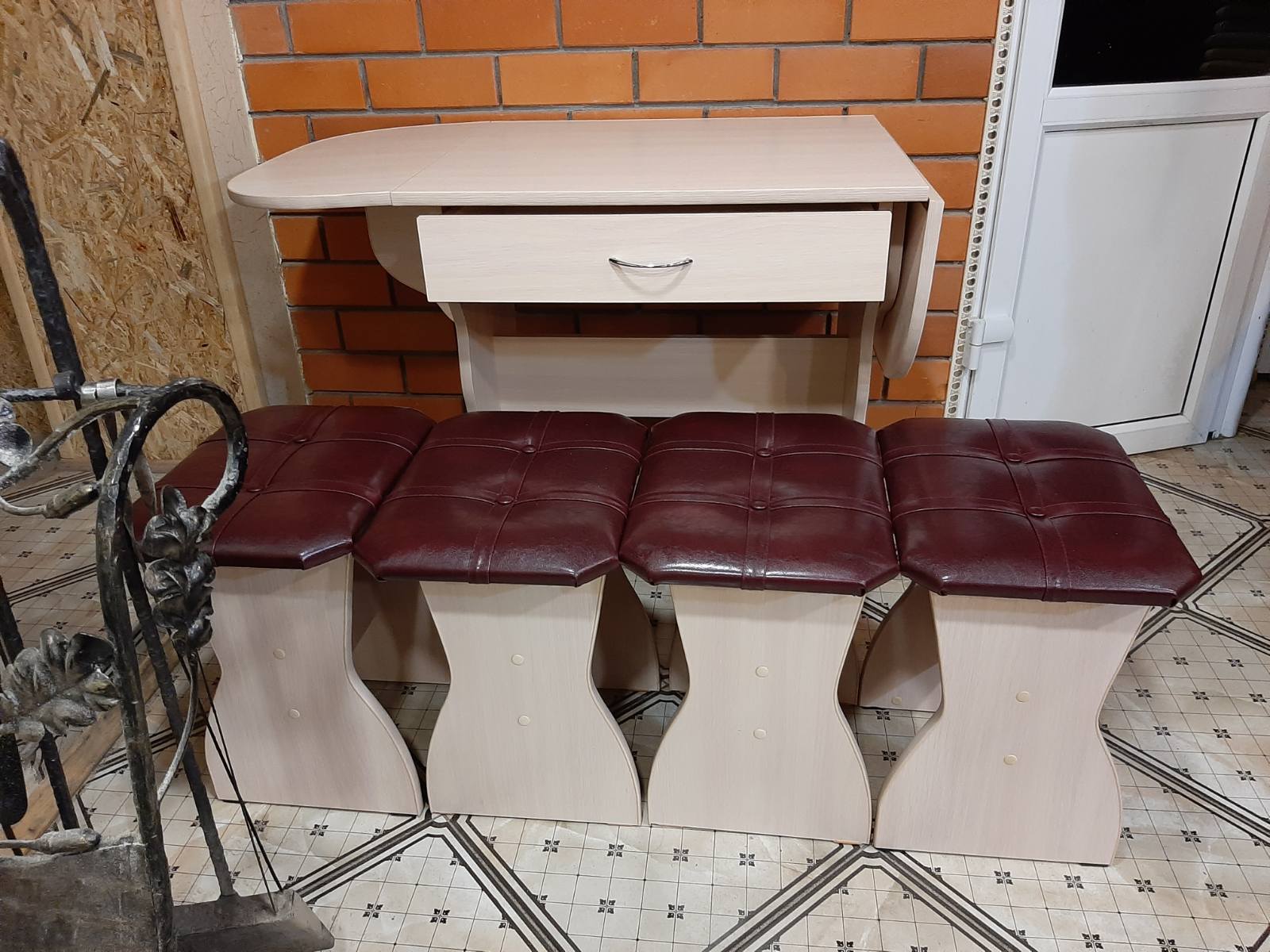 код 106157Набор включается в себя стол и четыре табурета. Сидушка с декором. Варианты обивки.