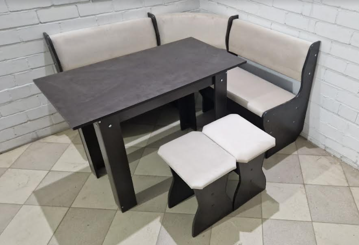 В набор входит: угловая скамья, стол, два табурета. Обивка: экокожа, ткань.