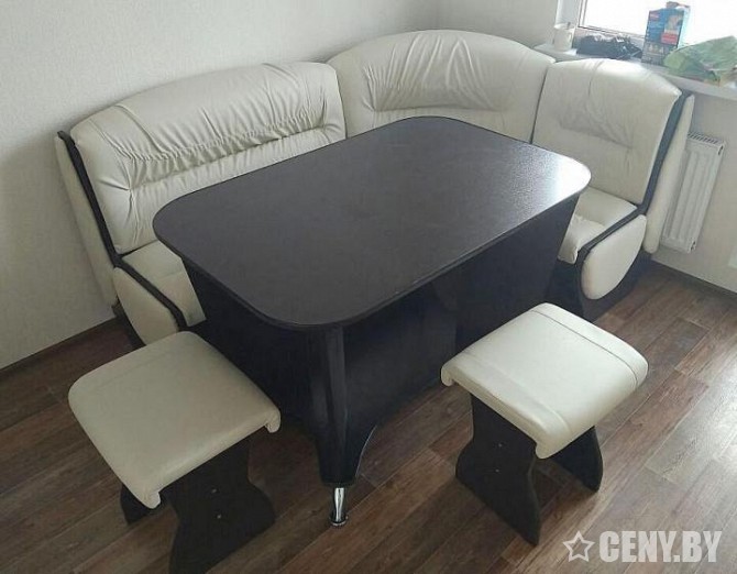 Стильный, функциональный и удобный кухонный уголок, который состоит из: угловой скамьи, стола и двух табуреток.