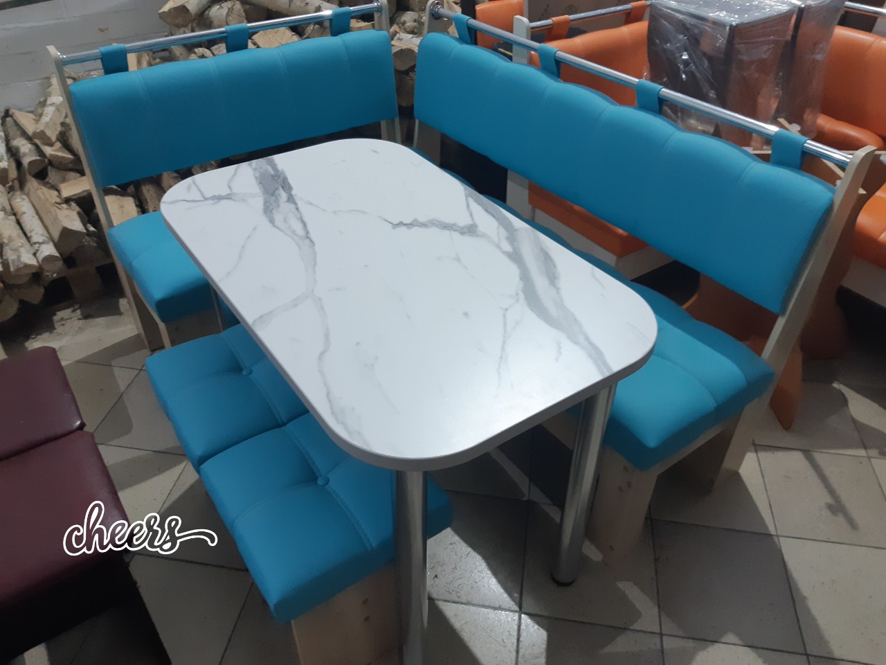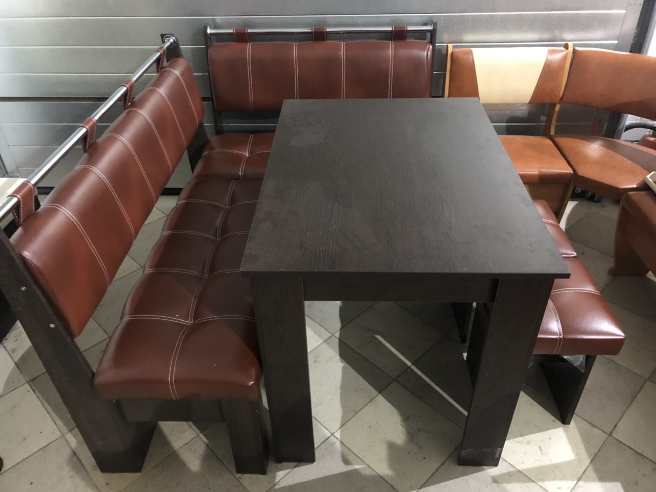 В набор входит угловая скамья, стол и два табурета. Множество вариантов цветов.