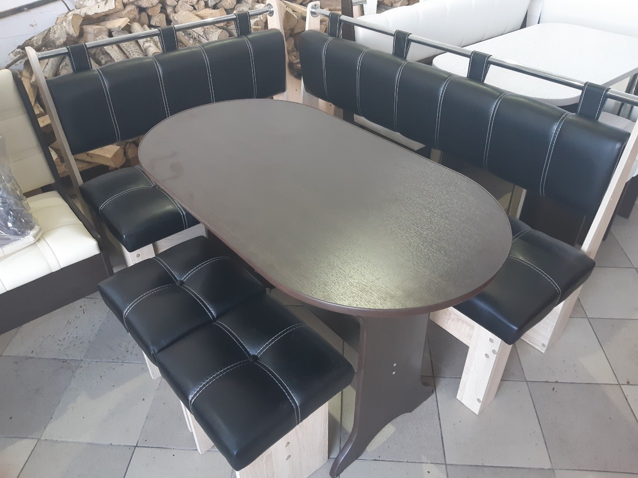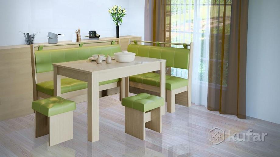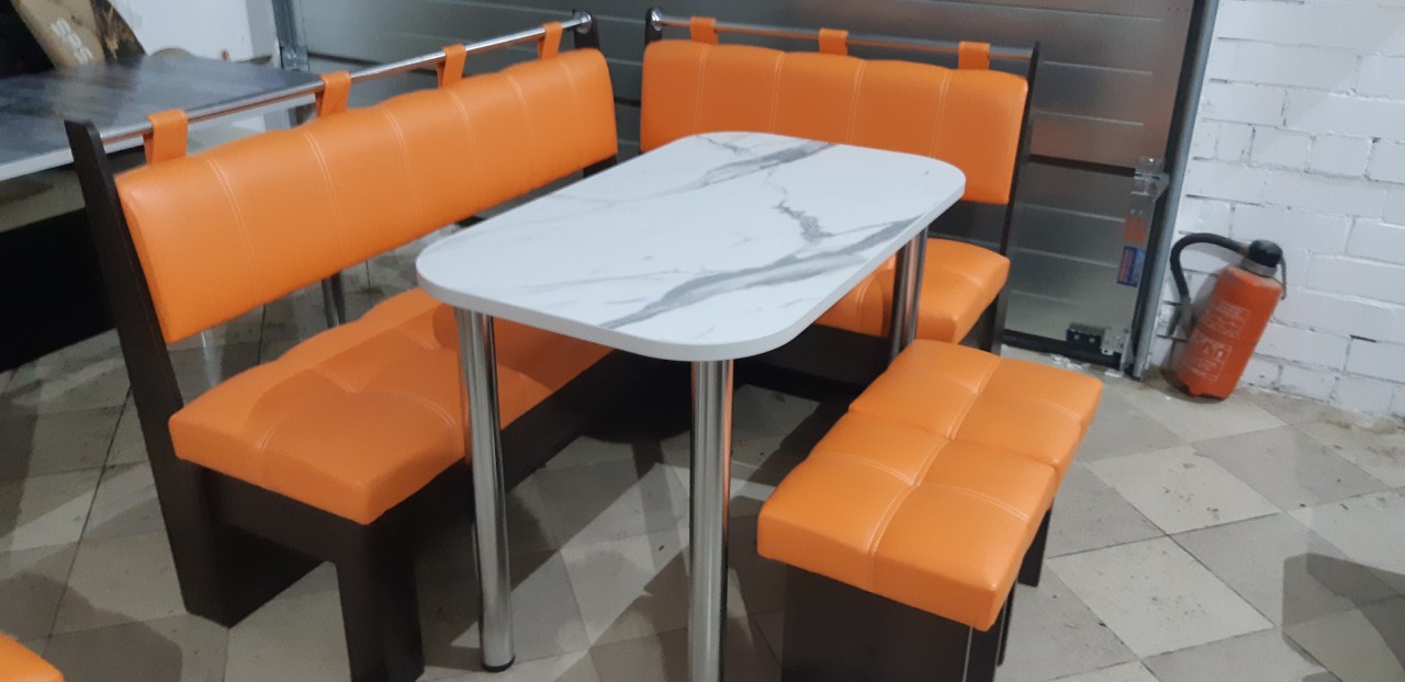 В набор входит угловая скамья, стол и два табурета. Цвет и размер на выбор.