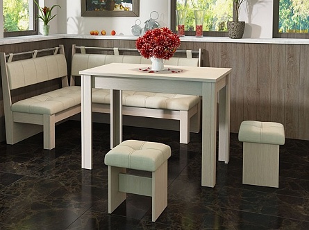 Состоит из углового кухонного дивана, обеденного стола и двух мягких табуретов. Под сиденьем находятся ящики для хранения. Универсальная сборка - право/лево.