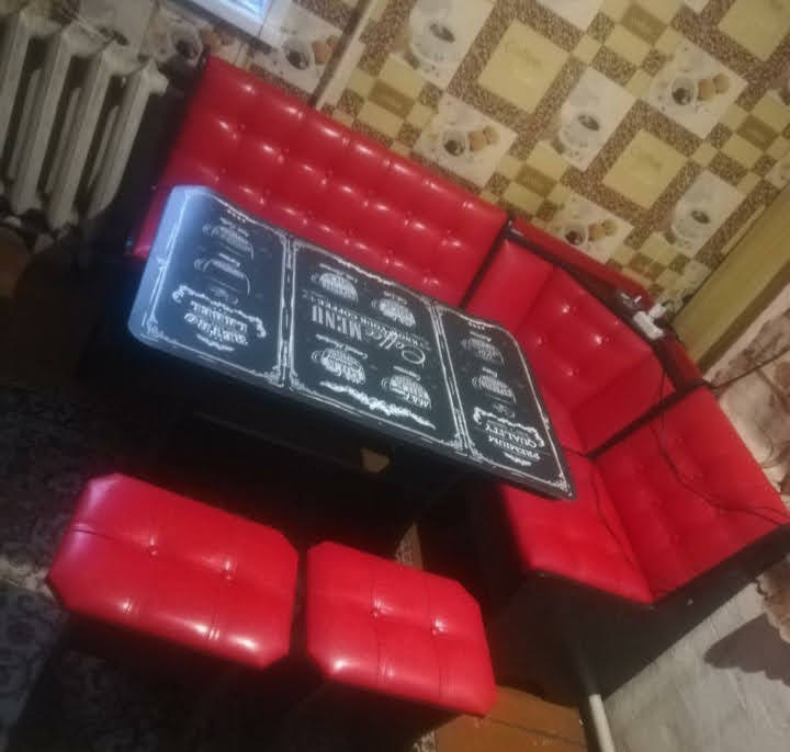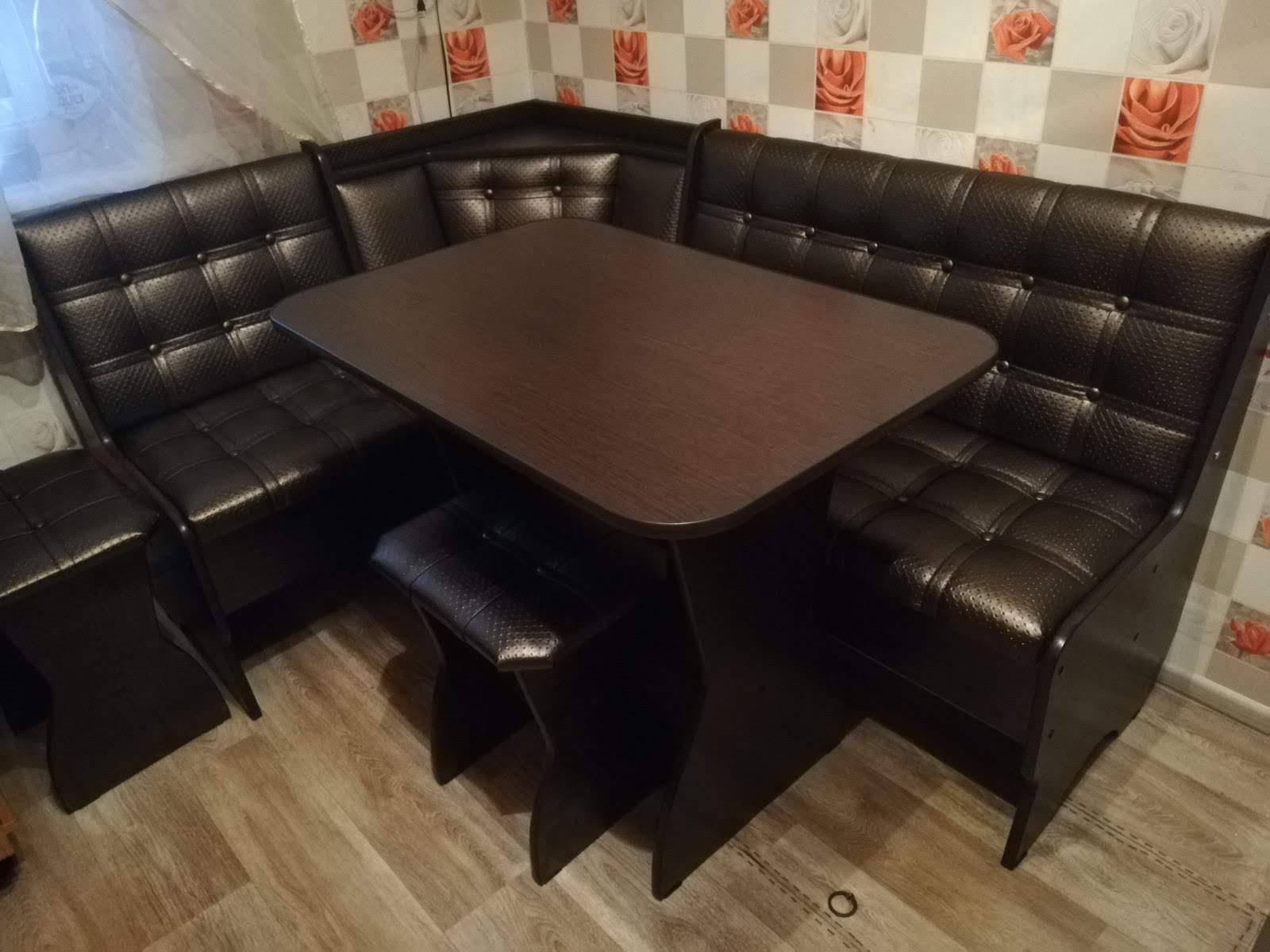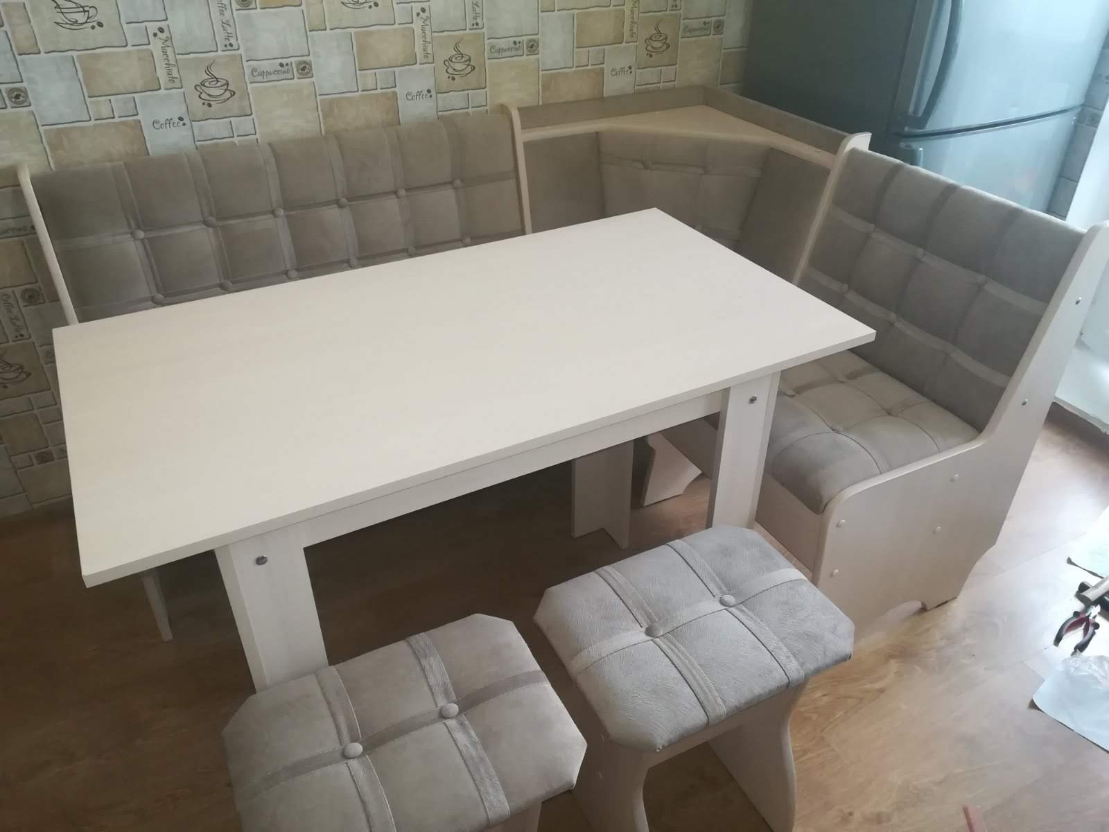 В набор входит угловая скамья, стол и два табурета. Цвет и размер на выбор.