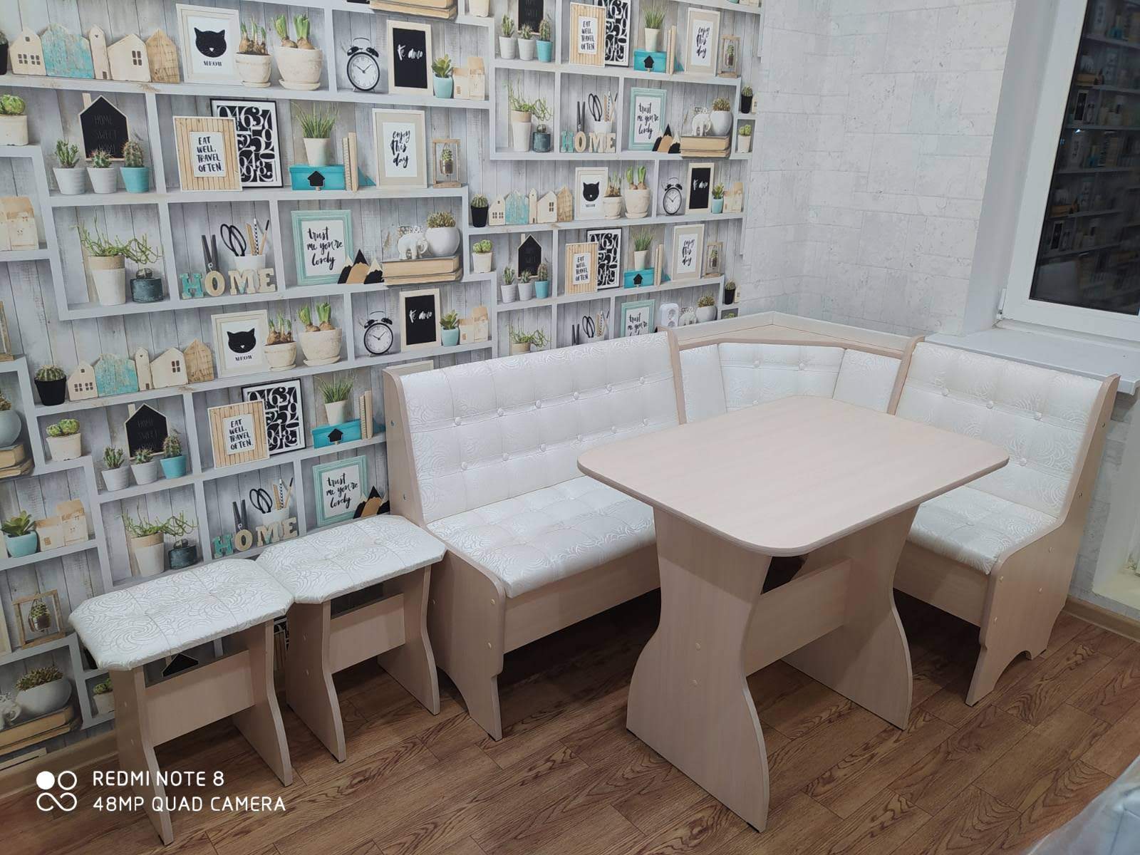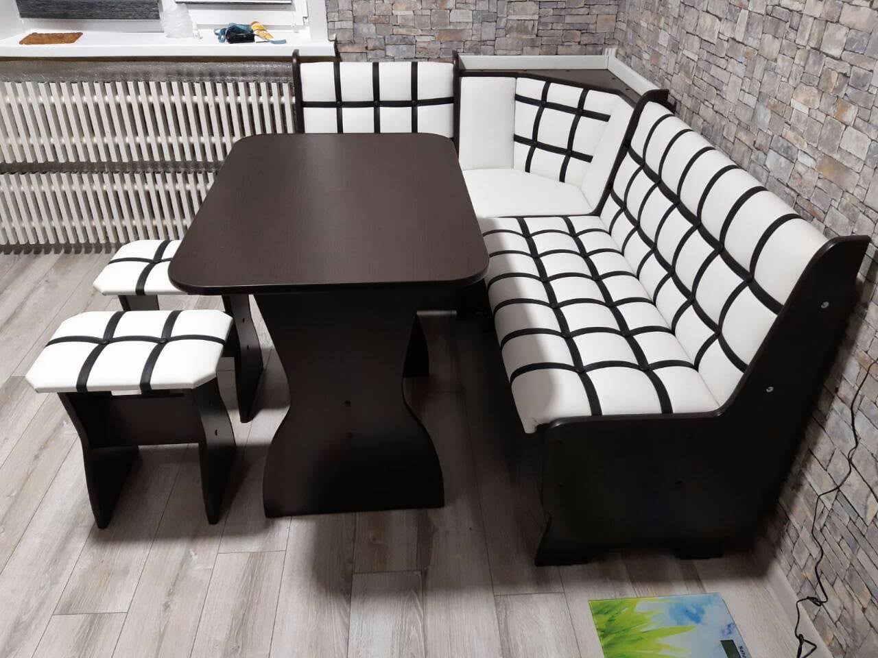 Состоит из углового кухонного дивана, обеденного стола и двух мягких табуретов. Под сиденьем находятся ящики для хранения. Универсальная сборка - право/лево.
