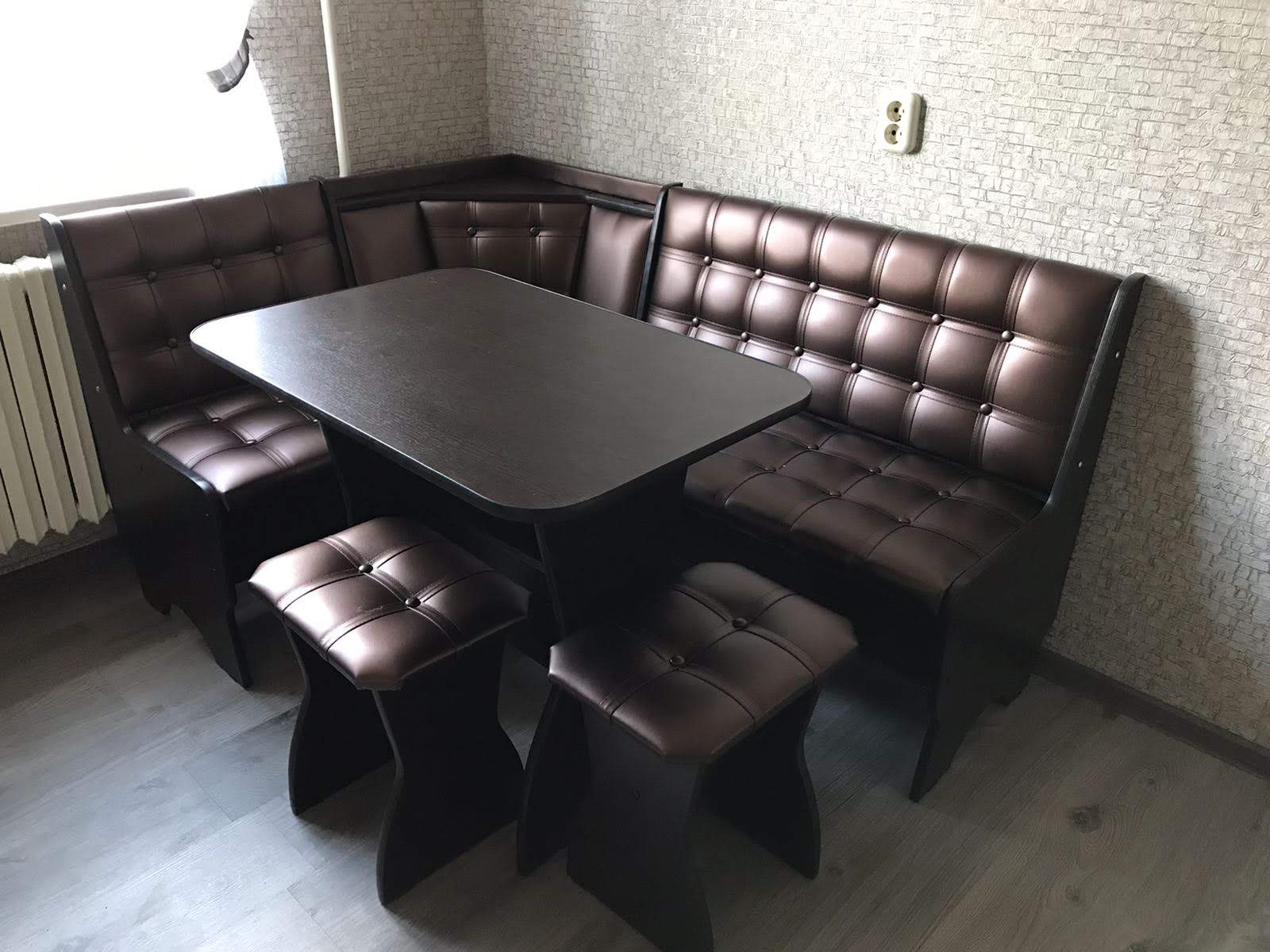 В набор входит: угловая скамья, стол, два табурета. Обивка: экокожа, ткань
