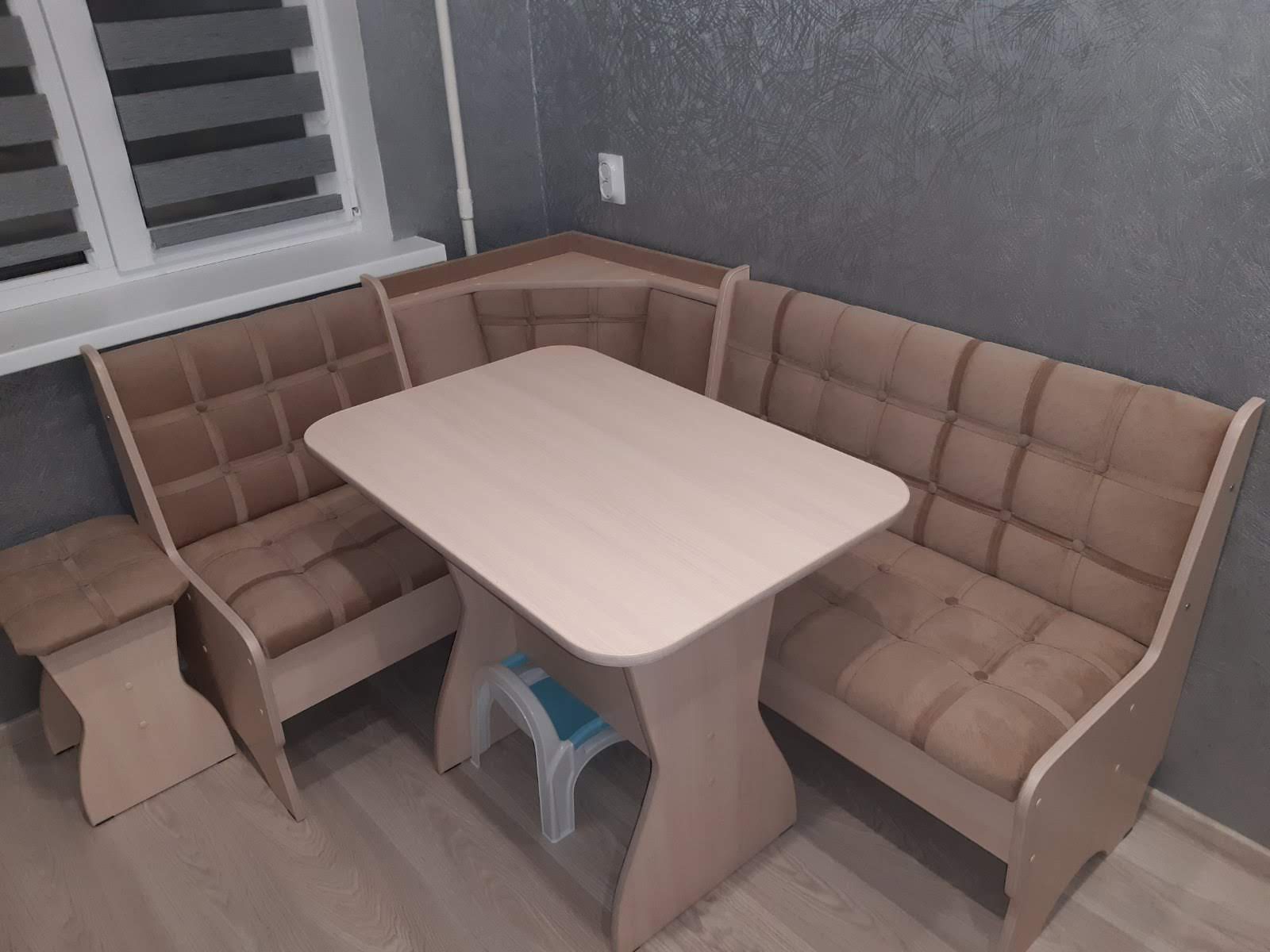 В набор входит угловая скамья, стол и два табурета. Цвет и размер на выбор.