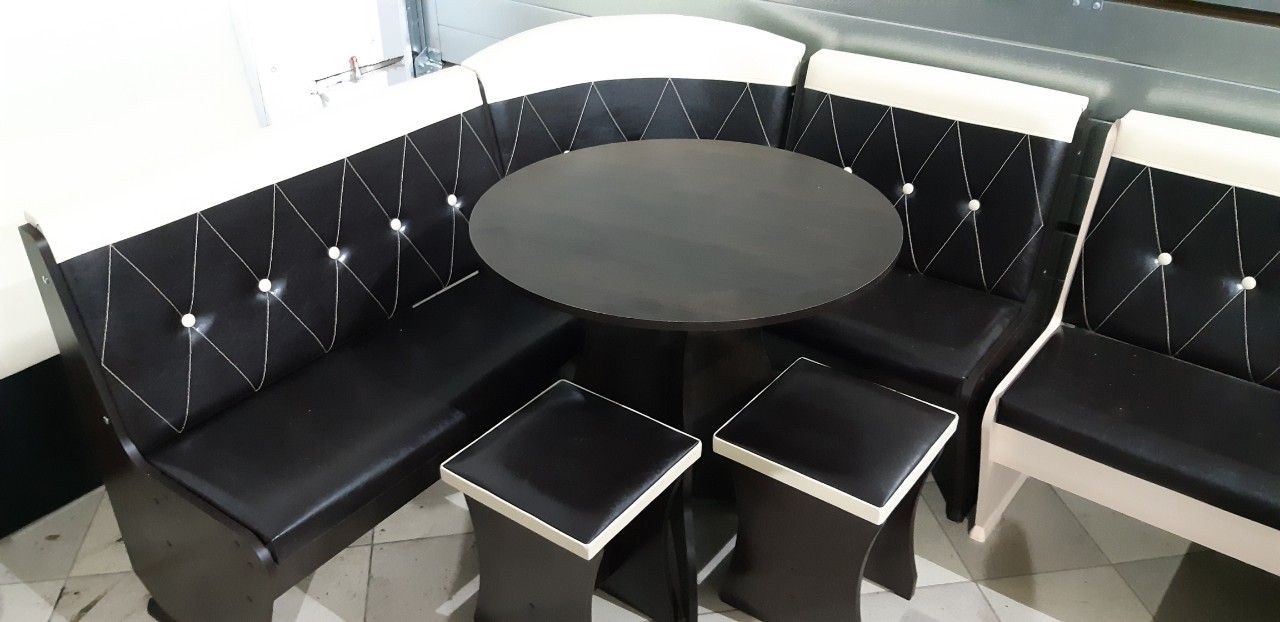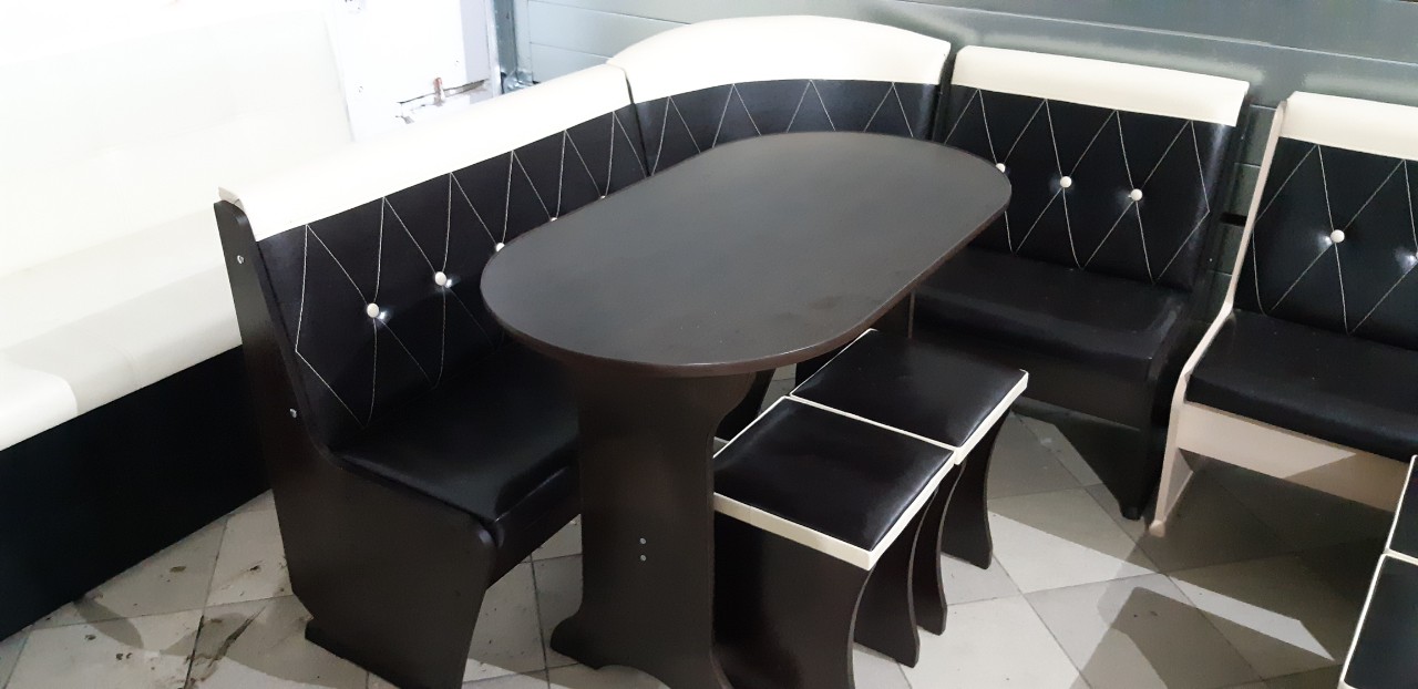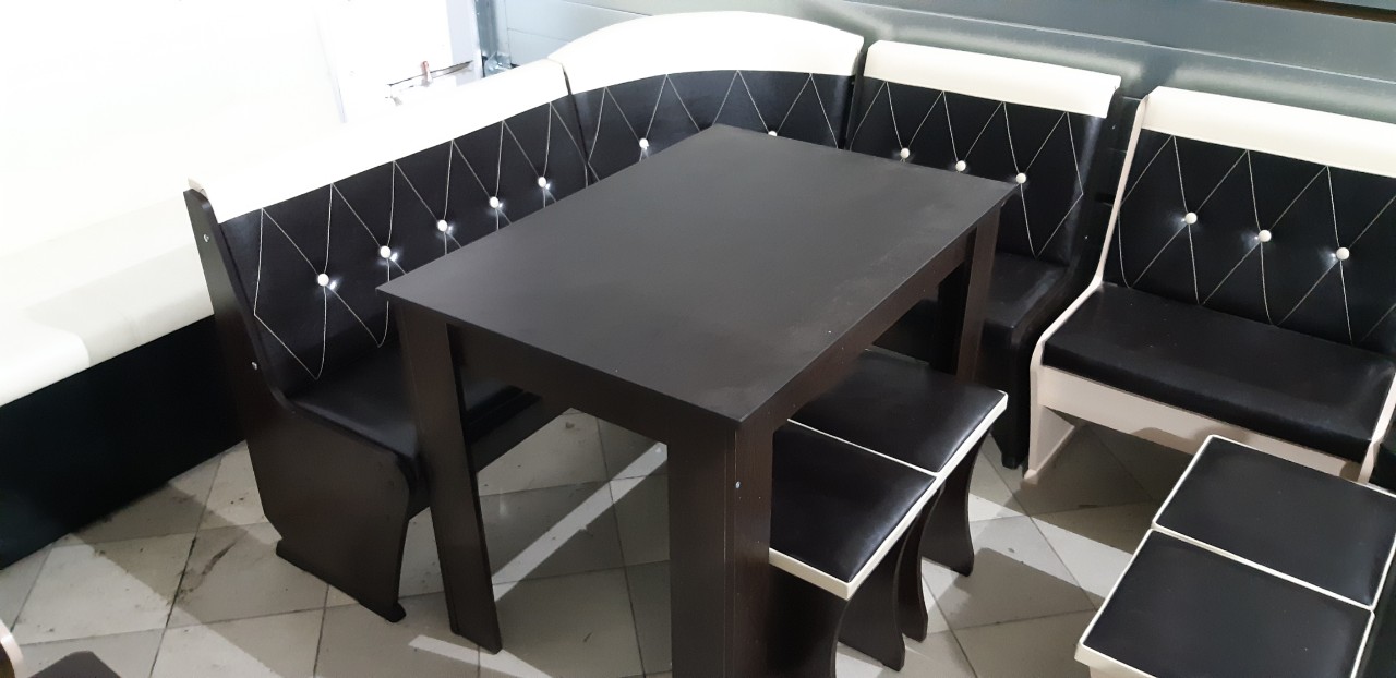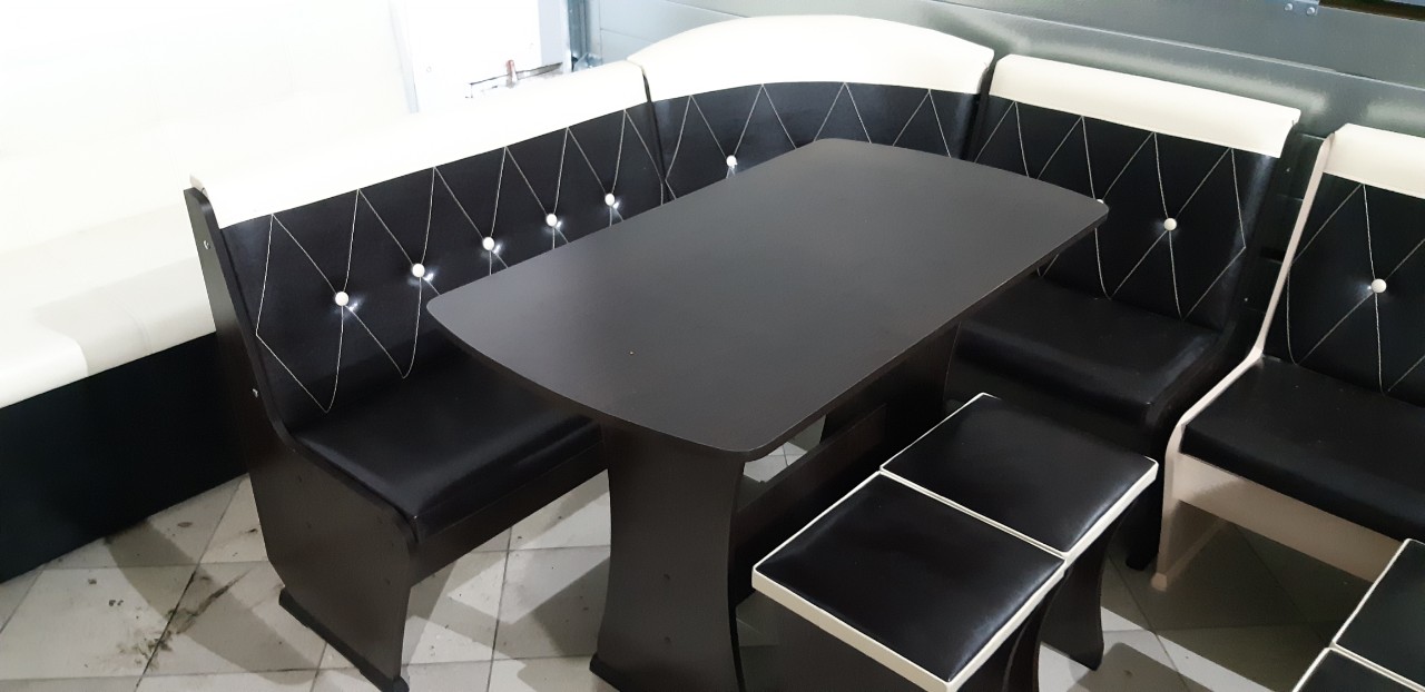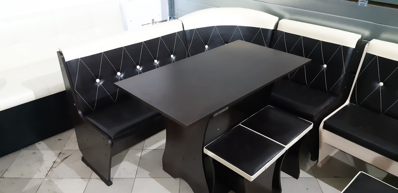 Состоит из углового кухонного дивана, обеденного стола и двух мягких табуретов. Под сиденьем находятся ящики для хранения. Универсальная сборка - право/лево.