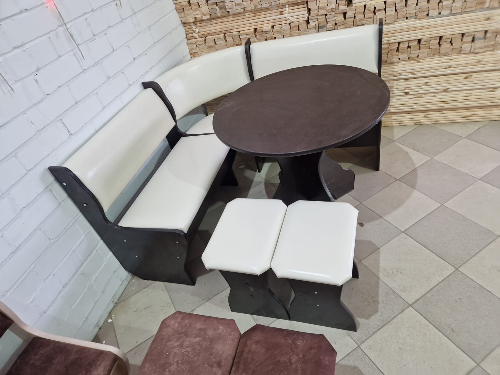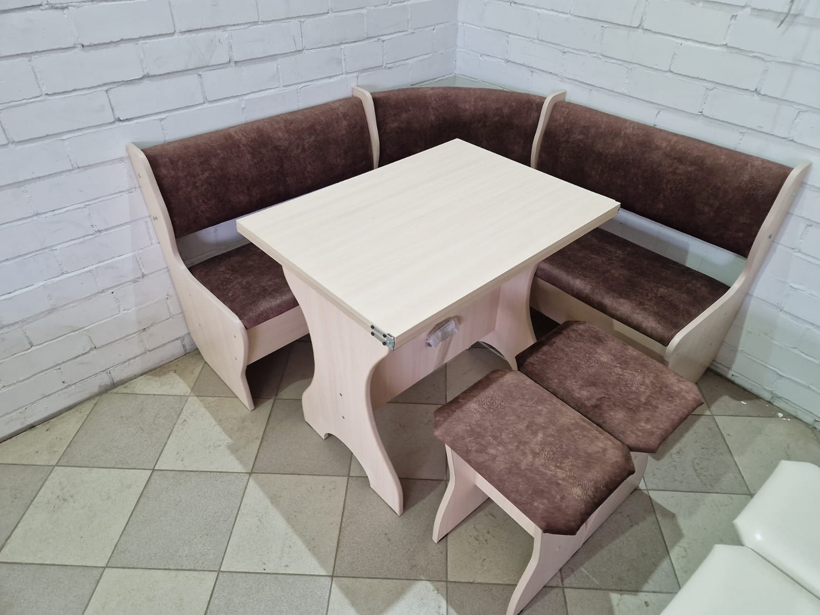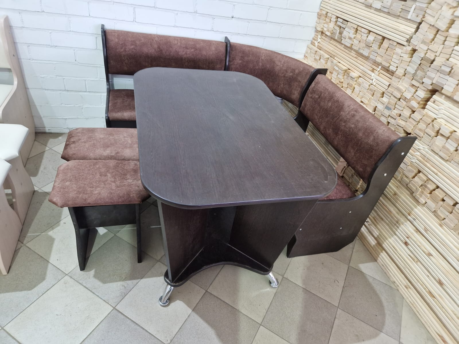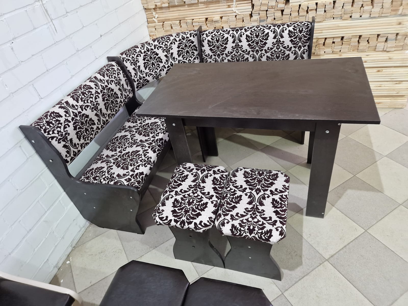 Компактная модель для небольшой по площади кухни. Угловая скамья, стол и два табурета.