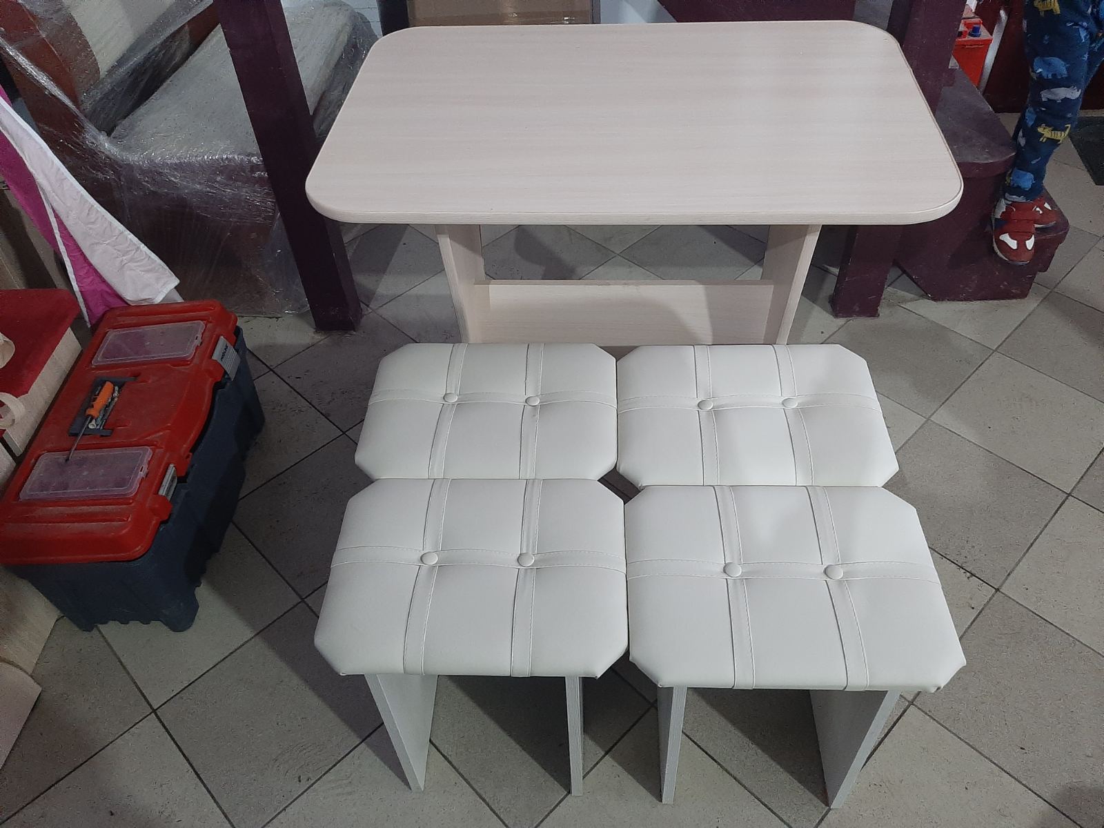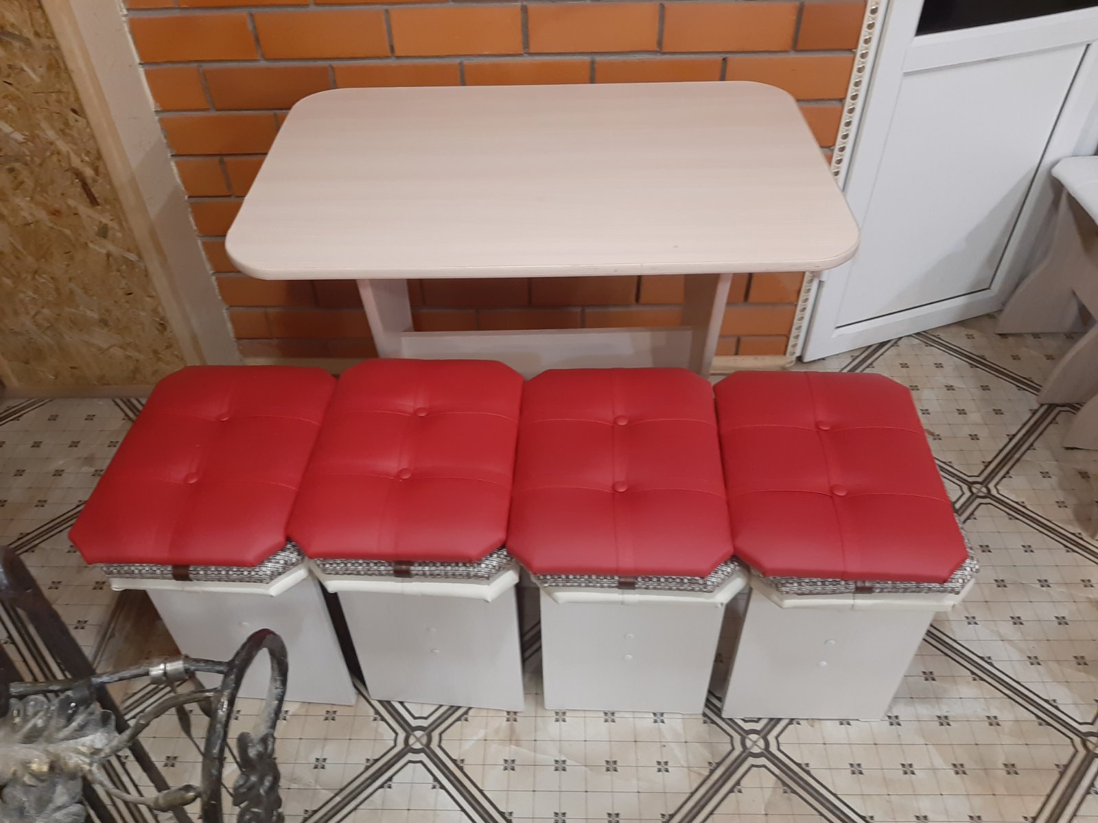 код 106155В набор входит стол и четыре табурета с красной обивкой. Доступен в разных цветах.