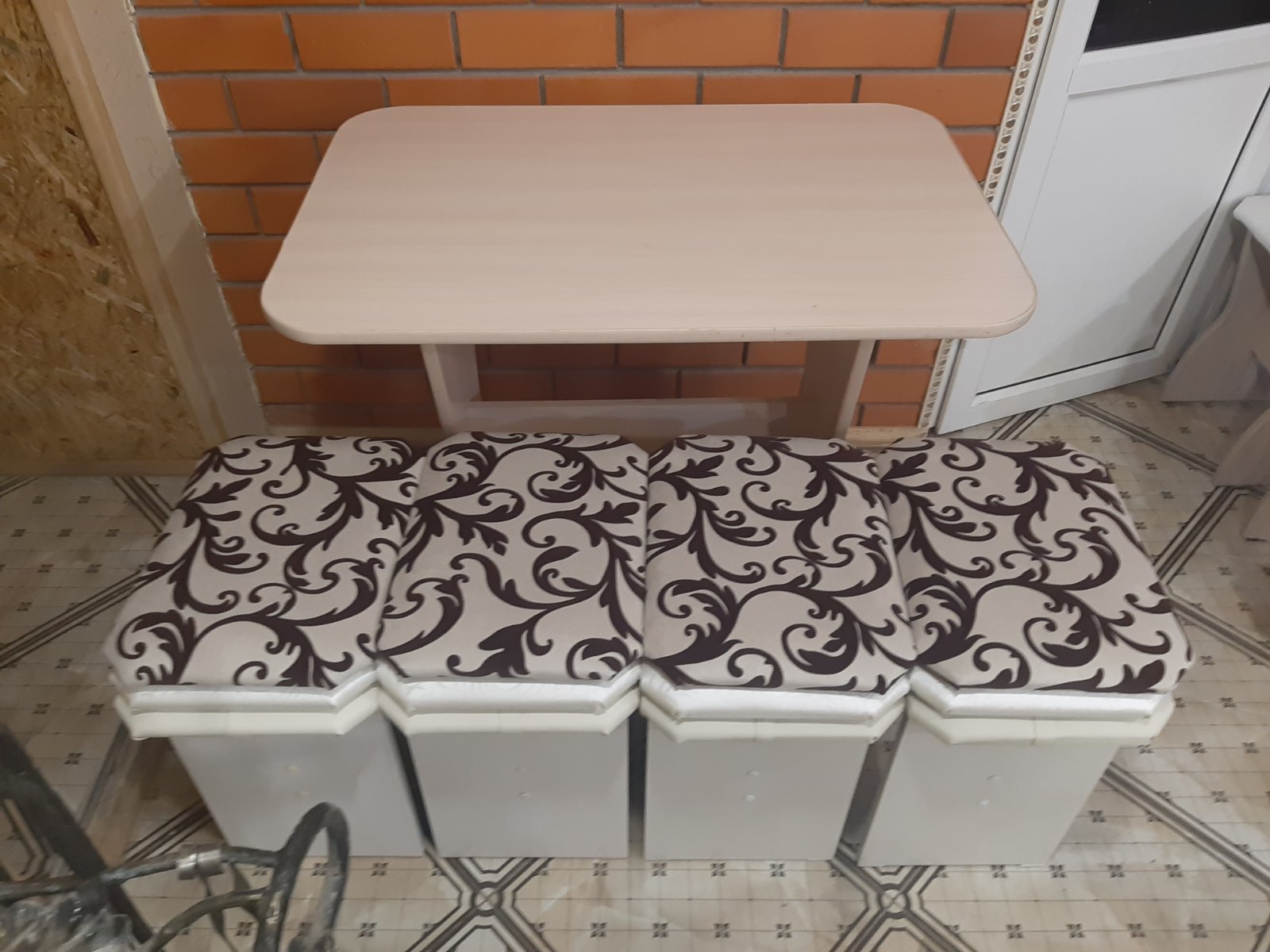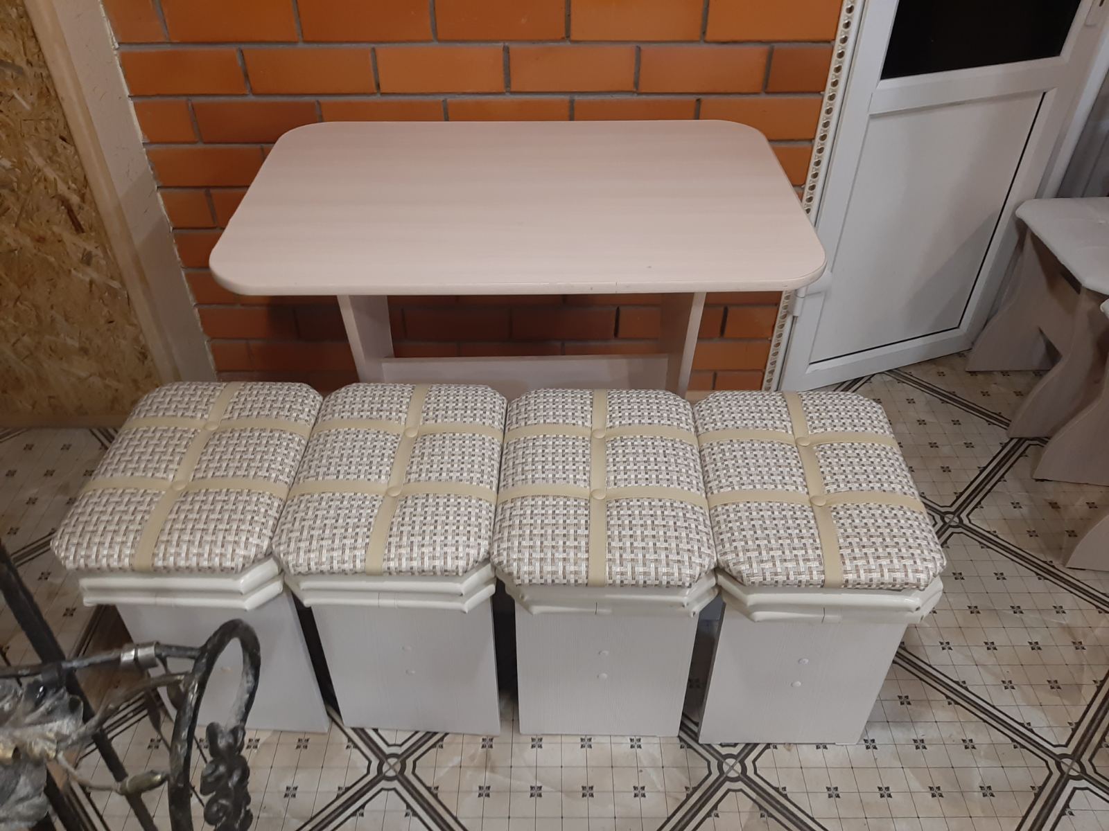 Состоит из: угловой скамьи, стола и двух табуреток. Два короба для хранения.