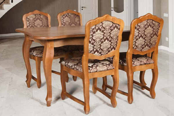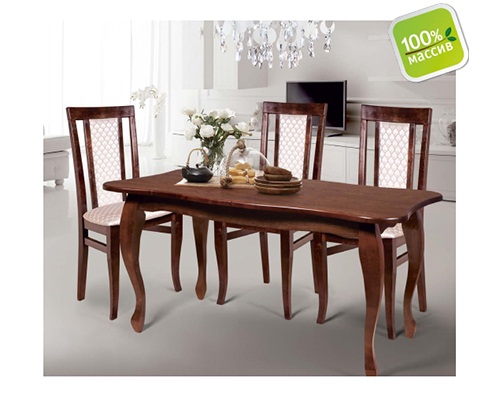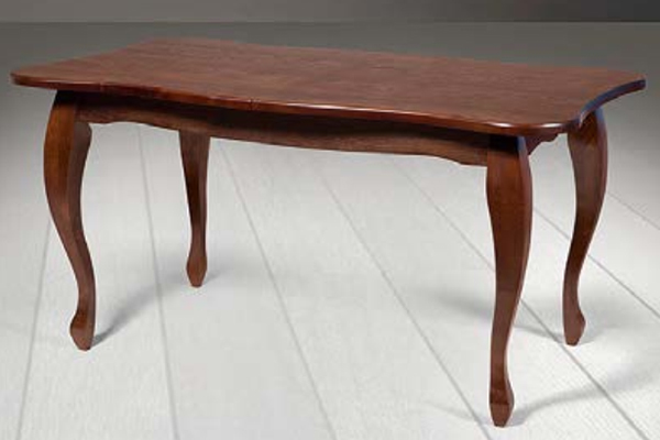 Обеденный стол из массива отличается необычными формами: фигурные царги и столешница гармонично сочетаются с изогнутыми ножками. Дерево может быть тонировано в темный цвет либо покрыто эмалью.
