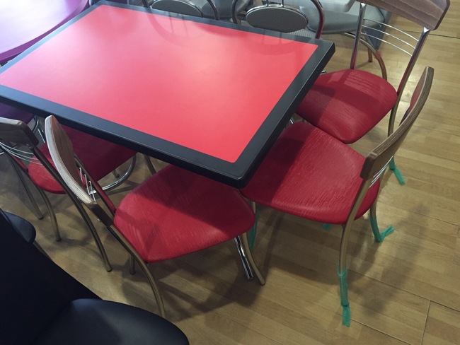 Кухонная обеденная мебель состоит из прямоугольного стола и стульев. Красная столешница декорирована черной окантовкой, что делает ее еще более яркой и дерзкой. Крышка установлена на хромированные ножки с пластиковыми заглушками для предотвращения повреждений напольной поверхности. Стол дополнен очень стильными стульями в той же цветовой гамме.