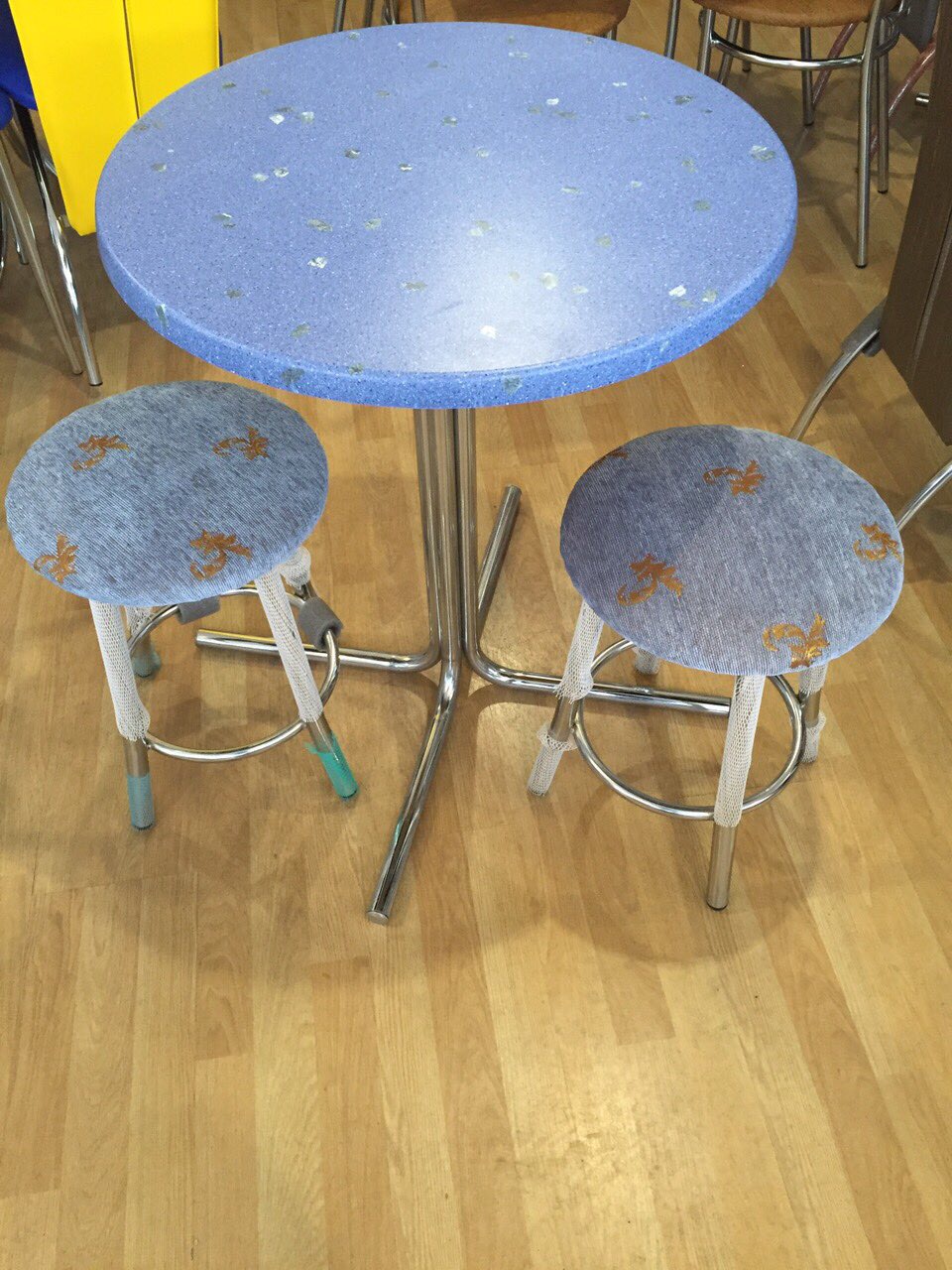Очень компактный набор мебели для небольшой обеденной зоны, который можно разместить не только на кухне, но и на лоджии, что сделает ваши посиделки не только уютными, но и романтичными. Круглая столешница стола выполнена в голубом цвете имитирующем мрамор, и дополнена небольшими серебристыми вставками, добавляющими торжественности и таинственности. Стулья с мягким сидением без спинки.