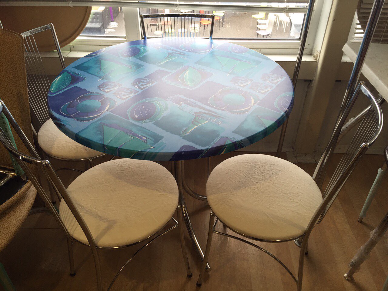 Круглый стол на металлических хромированных ножках, создающих очень устойчивую конструкцию, дополнен набором стульев, также выполненных из металла с мягким сидением. Данный набор мебели прекрасно впишется в кухни, столовые или кафе оформленные в стиле модерн.Расцветку вы можете подобрать самостоятельно, в зависимости от ваших вкусовых предпочтений.