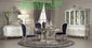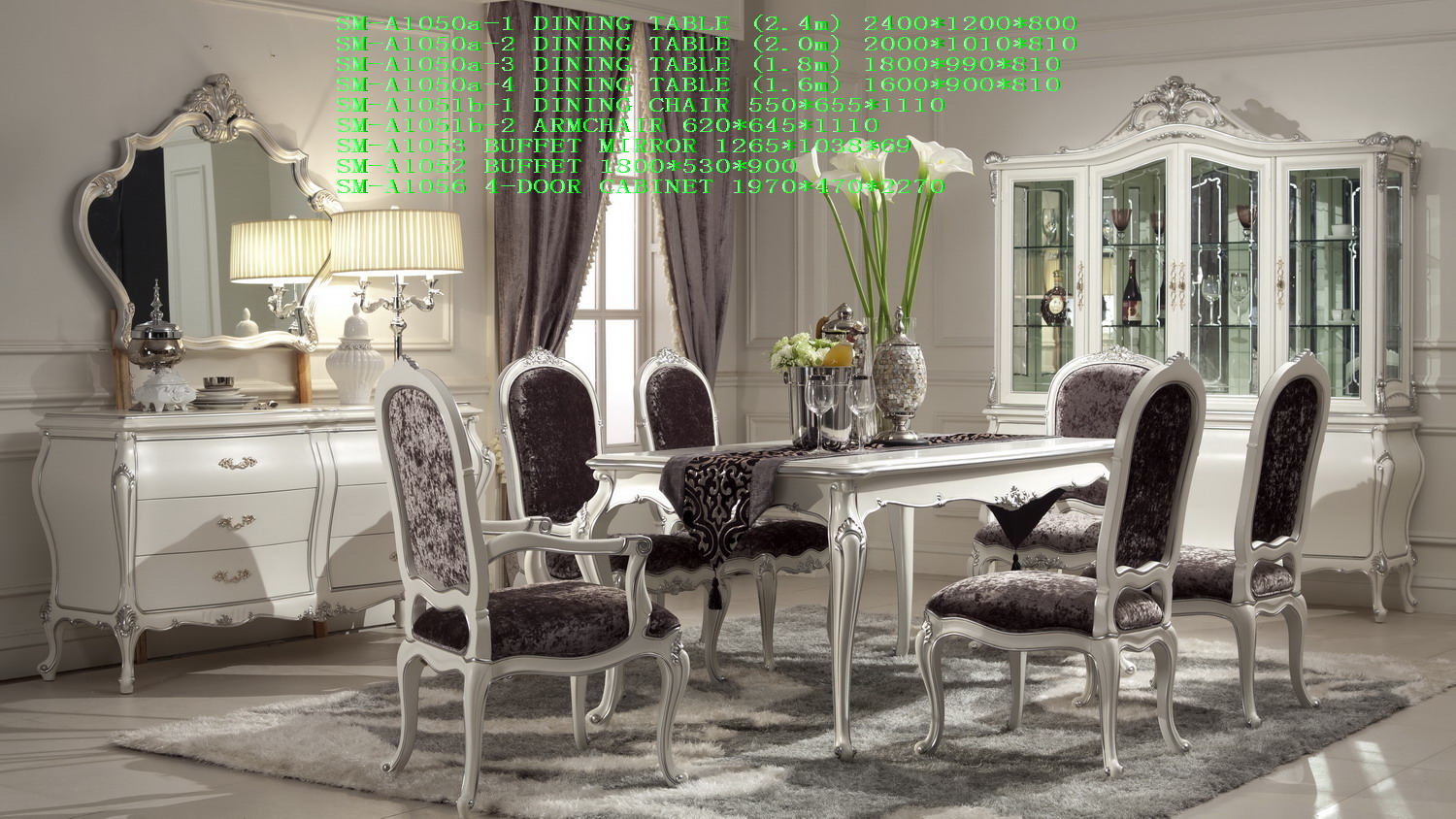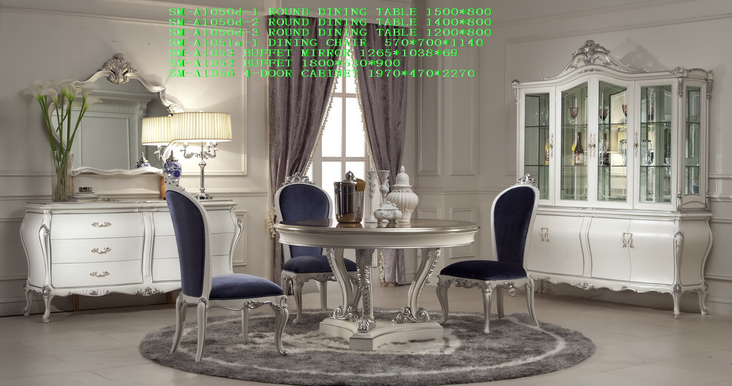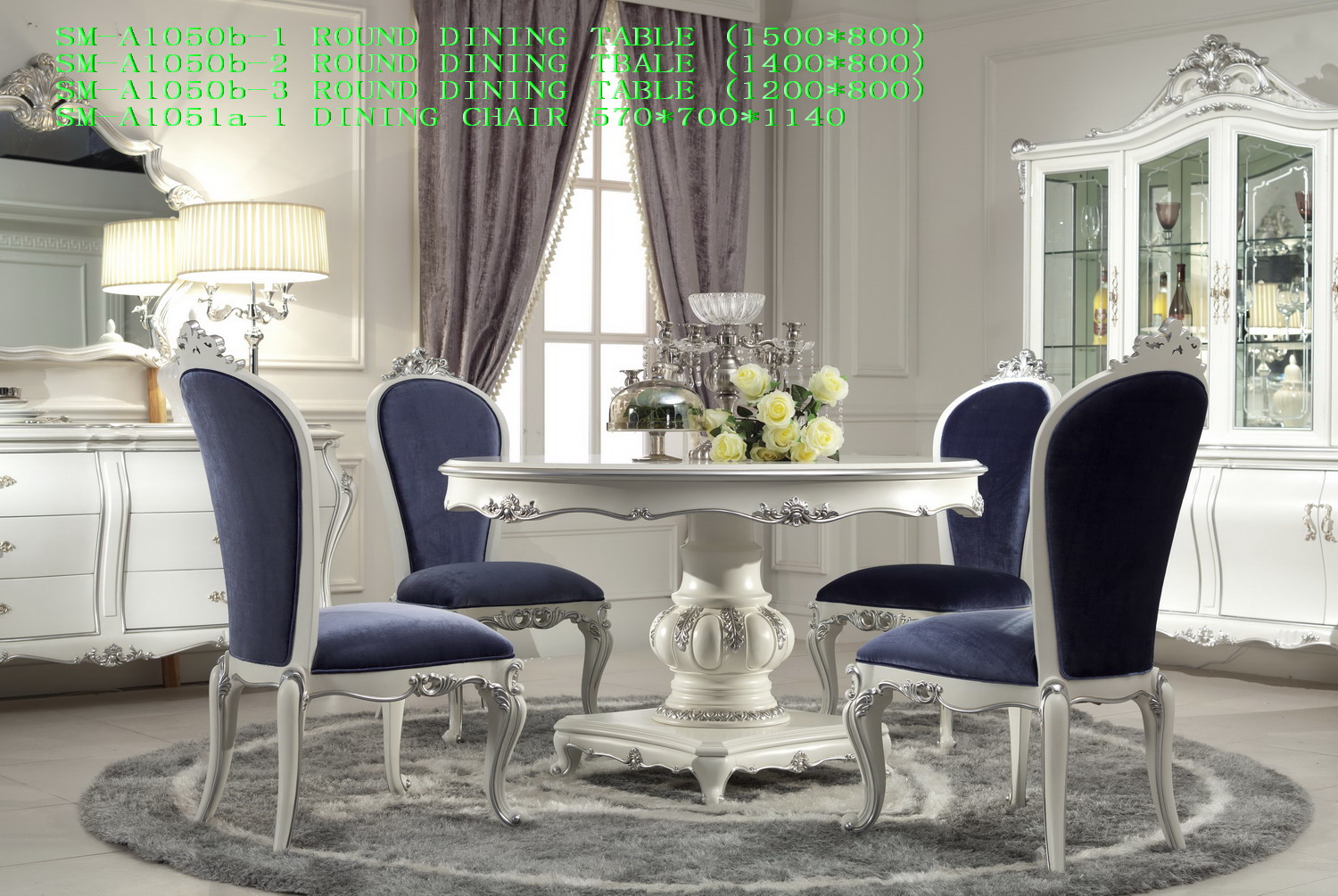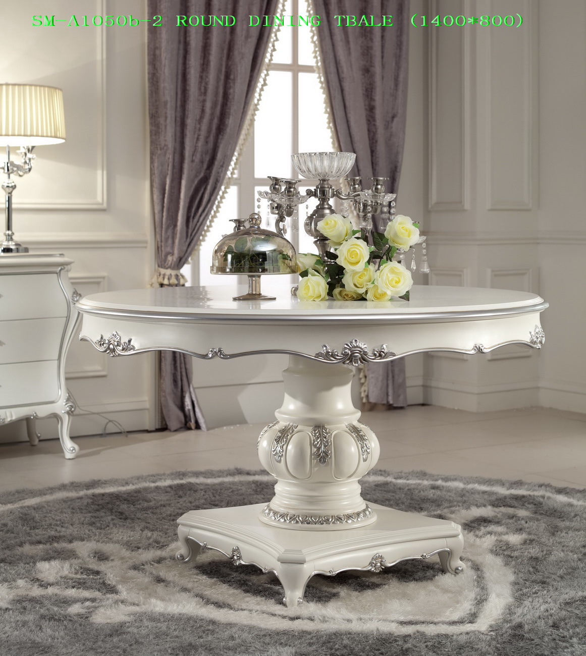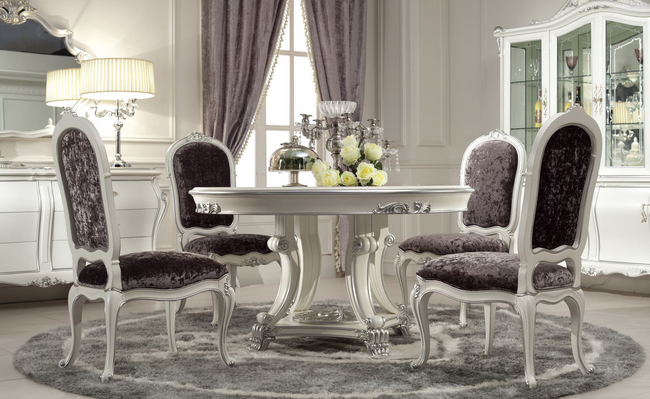 Классический стиль. Гнутые ножки круглого стола объединены низким подстольем. Резные элементы покрыты серебристым налетом.