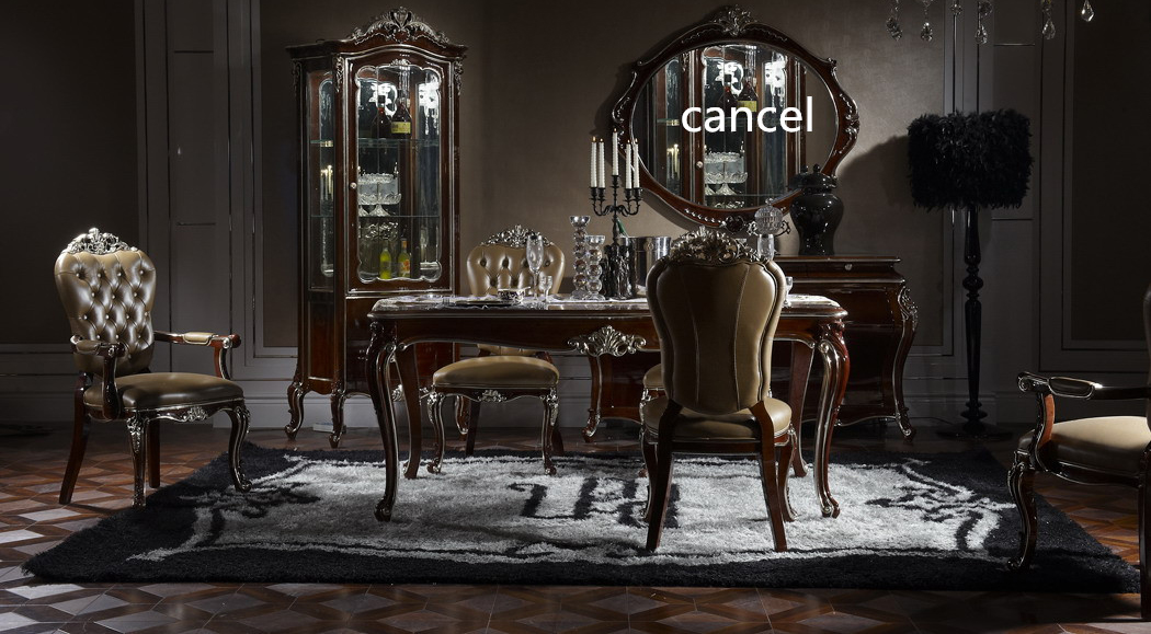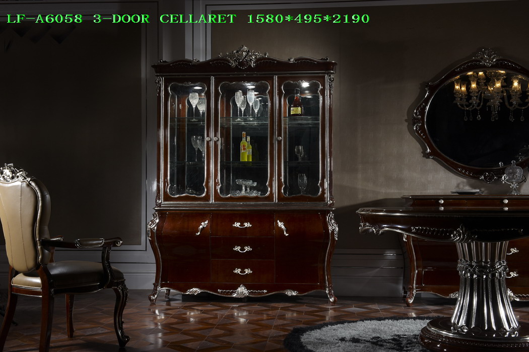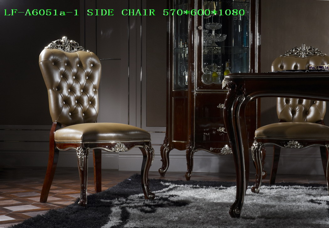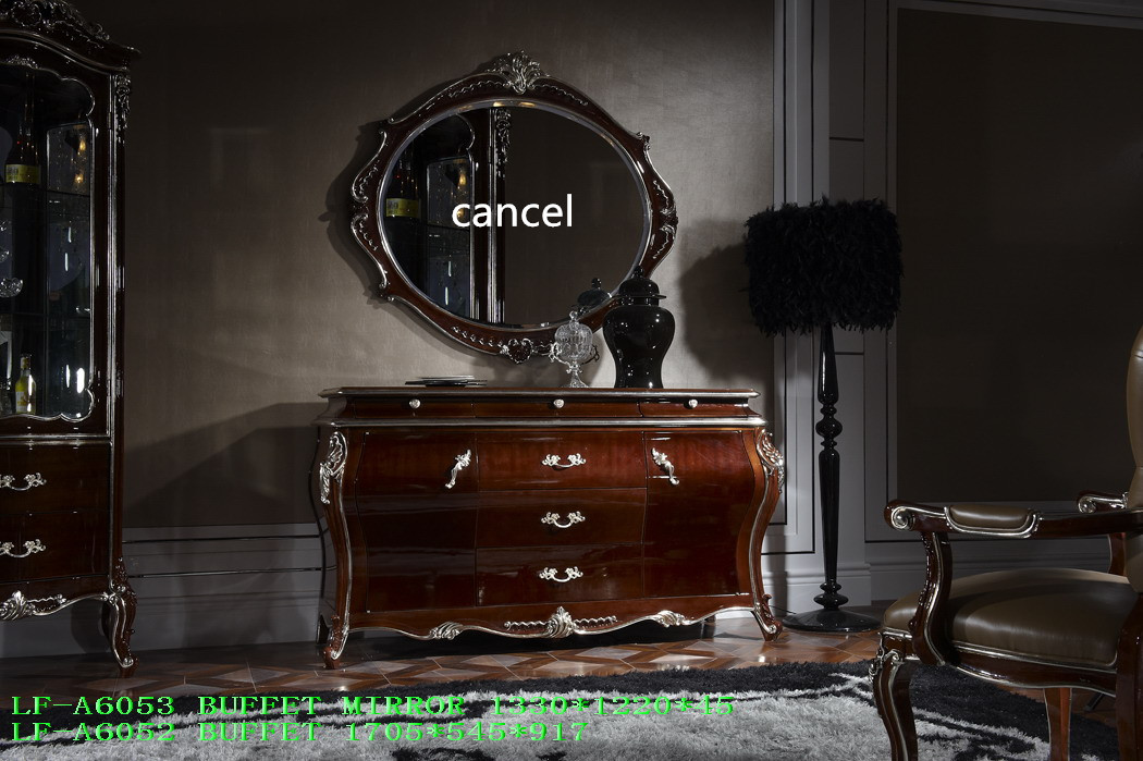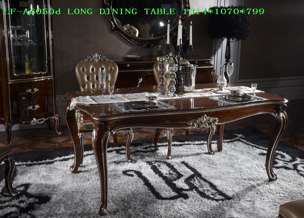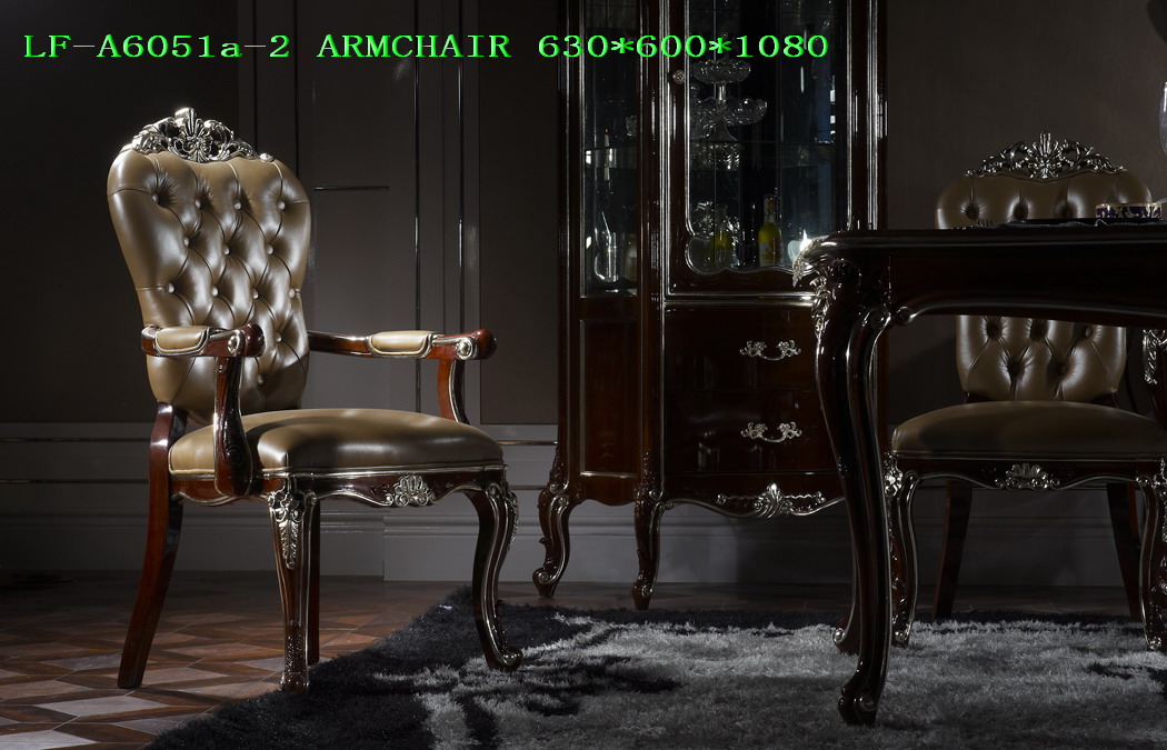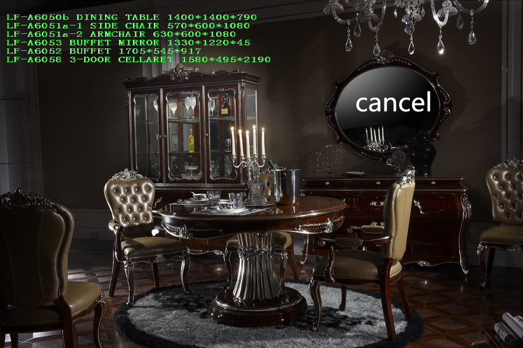 В комплект столовой группы «LF-A6050d» входят: стол, стул, стул с подлокотником, комод, зеркало, витрина 1- дверная. Набор изготовлен из массива дерева и натуральной кожи.