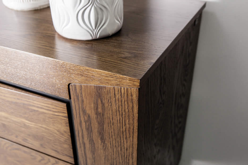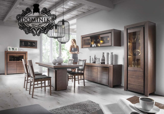 Просторный стол на единой опоре весьма компактен в сложеном виде, за раскладной моделью легко разместятся нагрянувшие гости. Стулья на деревянном открытом каркасе с вогнутой спинкой и сиденьем в черной кожаной обивке. Фасады буфетов и тумб изобилуют застекленными элементами витрин в асимметричных широких рамах в бликах встроенной подсветки. Внешние ручки отсутствуют в пользу минималистичного стиля и большей функциональности фурнитуры.