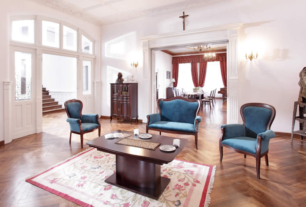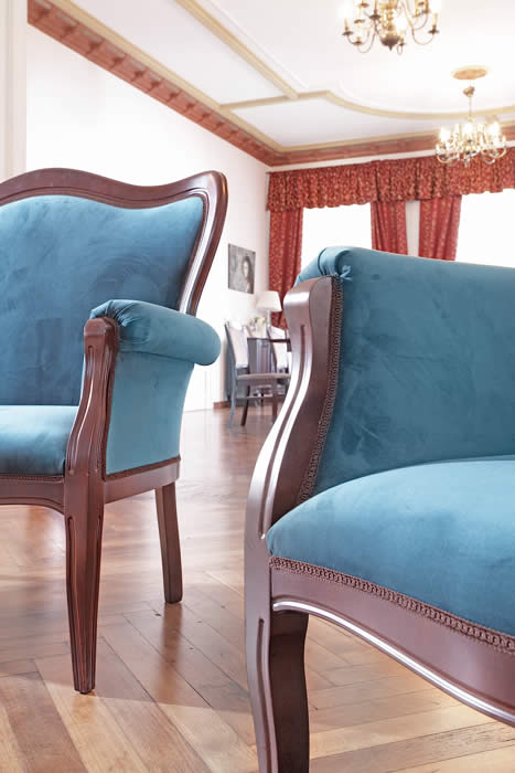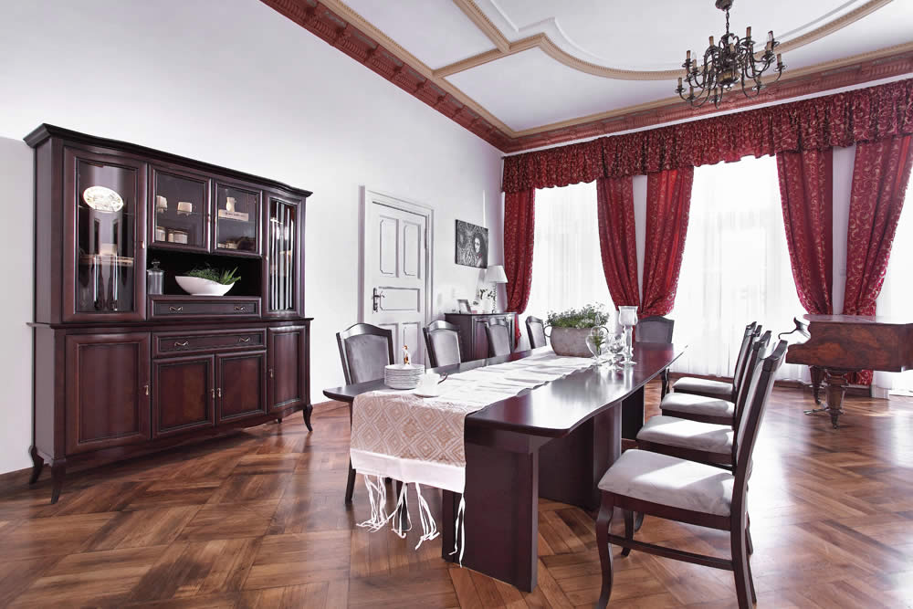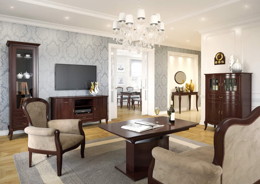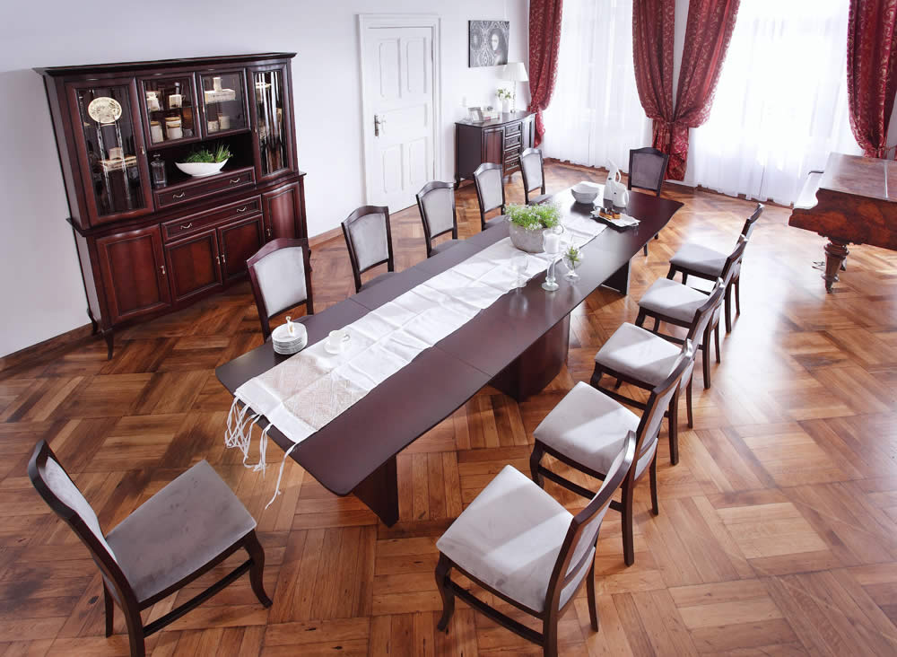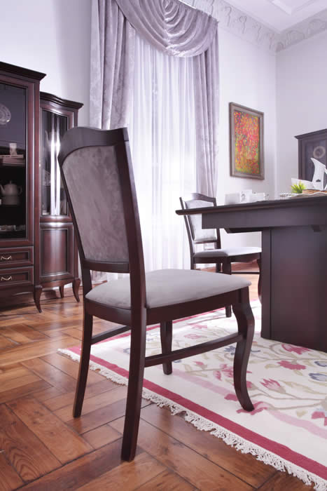 Современная столовая мебель из натуральных материалов: массив древесины и шпон в расцветке темного ореха. Столовый гарнитур выполнен в классическом стиле с применением выпуклых фасадов в филенках с патиной и витрин, карнизов и гнутых ножек. Стол с прямоугольной столешницей в аккуратно фрезерованной кромке и закругленными углами, полезная поверхность легко увеличивается при случае необходимости за счет складных панелей и дополнительных ножек. В сложеном виде компактный стол возвышается на единой прямоугольной закрытой опоре. Стулья на волнистых ножках с мягкими сиденьями и спинками в светло-серой обивке.