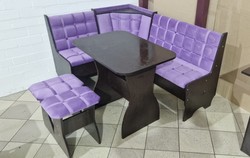 Стильный, функциональный и удобный кухонный уголок, который состоит из: угловой скамьи, стола и двух табуреток.