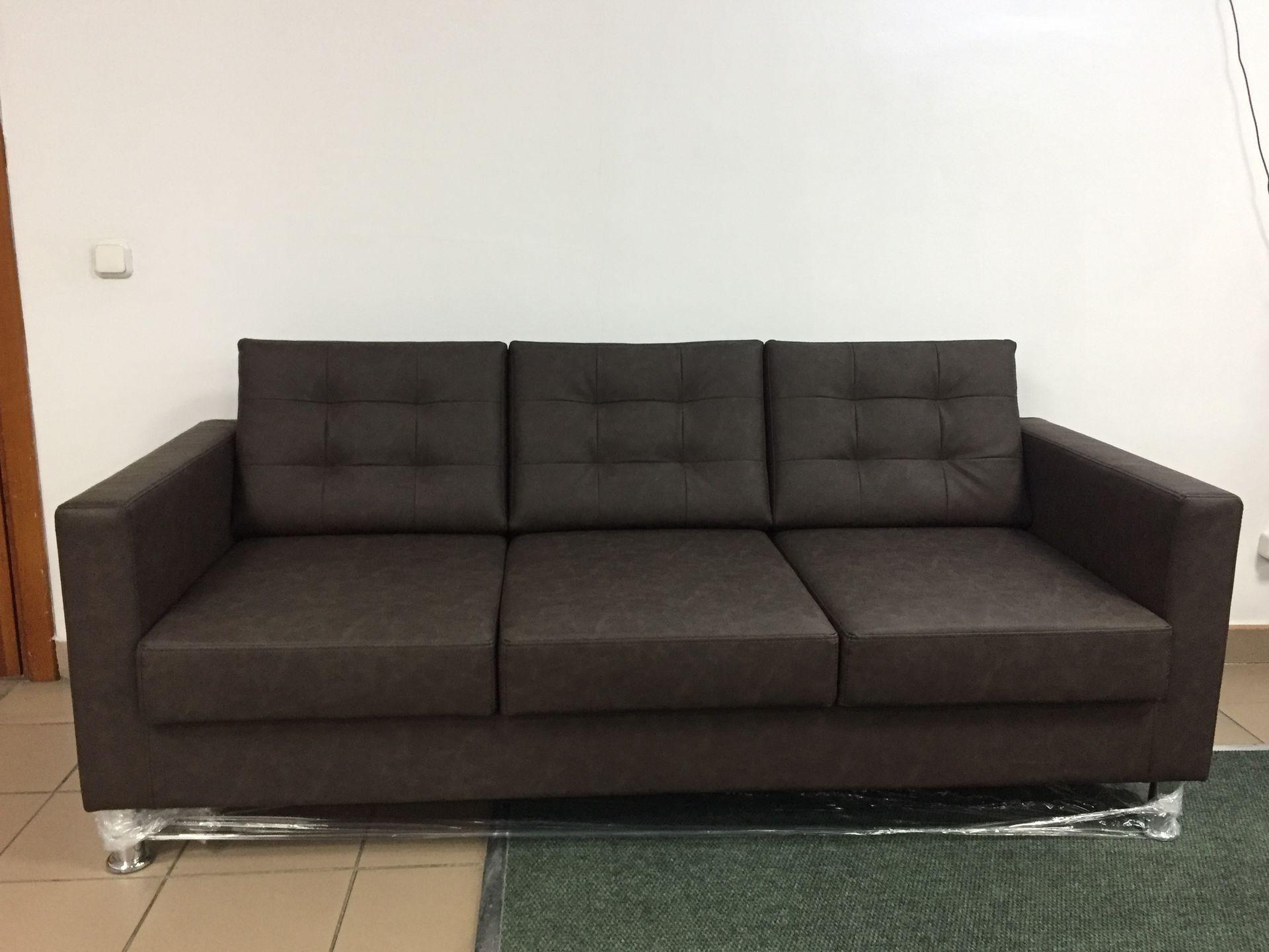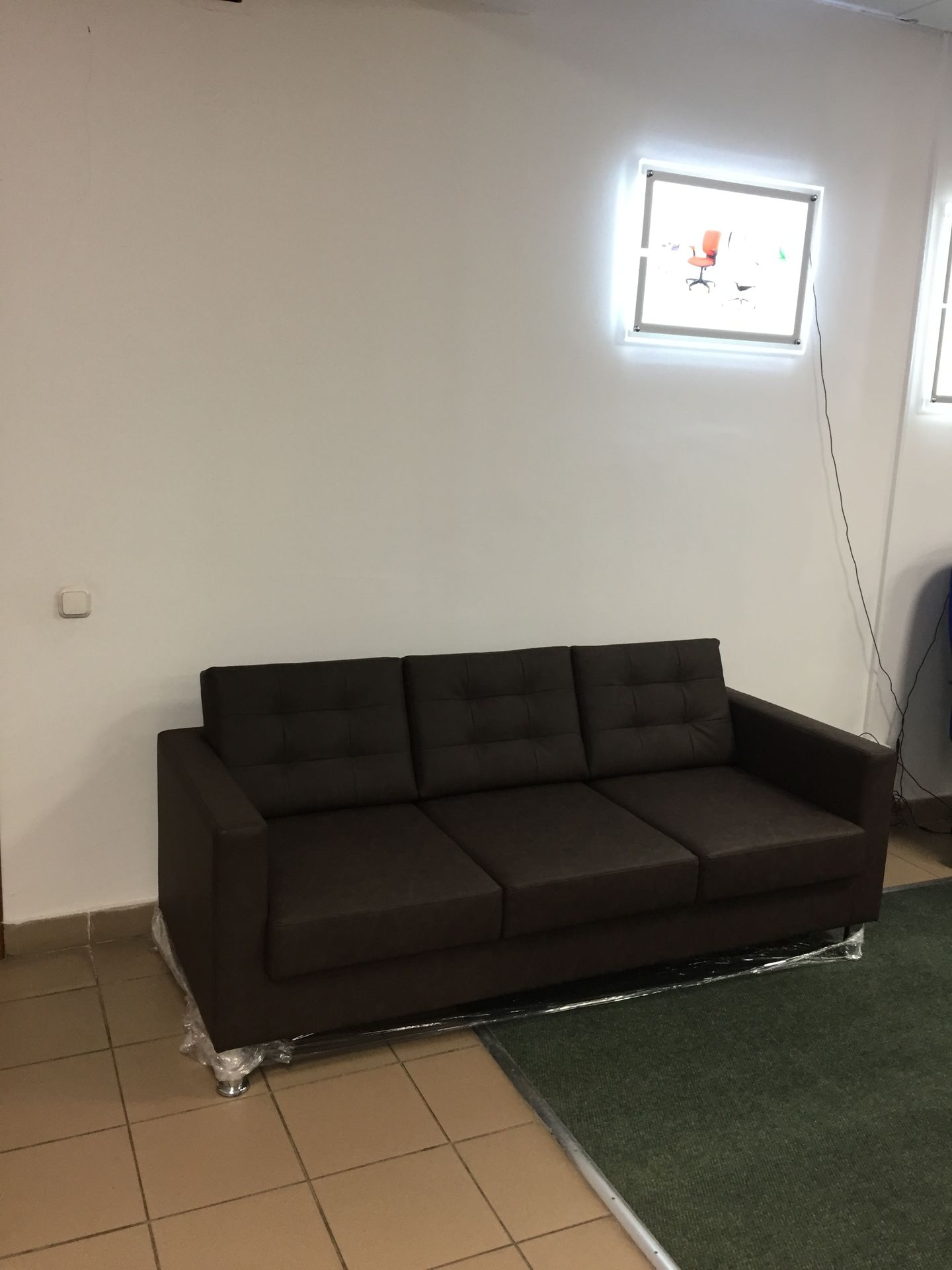 Офисный трёхместный диван, обитый экокожей. Это практичное и стильное решение для создания комфортной рабочей атмосферы в офисе.