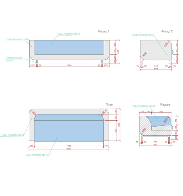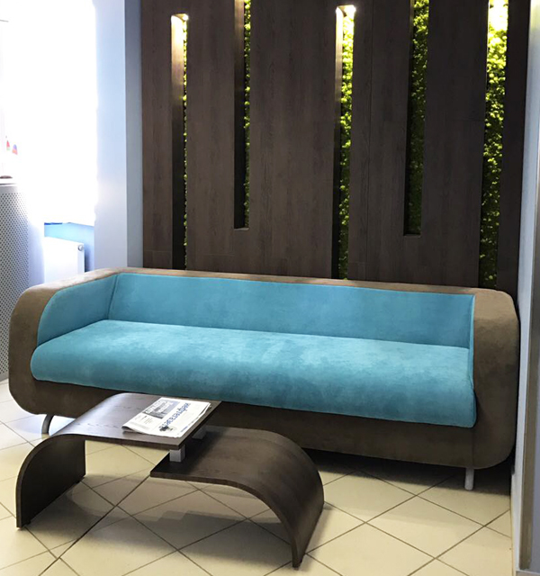 Диван изготовлен по подробному чертежу, предоставленным заказчиком - нераскладываемый диван на металлических опорах с невысокой спинкой и мягким сидением, большие радиусы закруглений по основным видимым рёбрам. Приятная на ощупь бархатистая обивка выполнена в стильной комбинации: сиденье, внутренняя сторона боковин и спинки светлого бирюзового оттенка, кромка П-образной спинки и лицевая часть основания бежево-коричневого цвета.