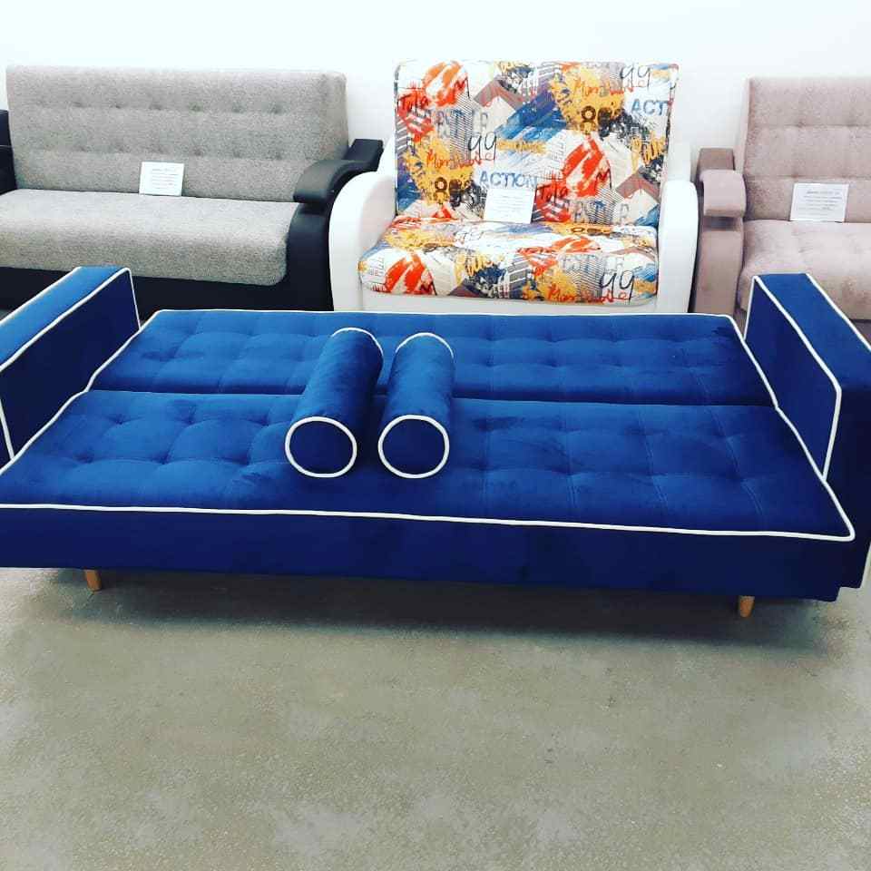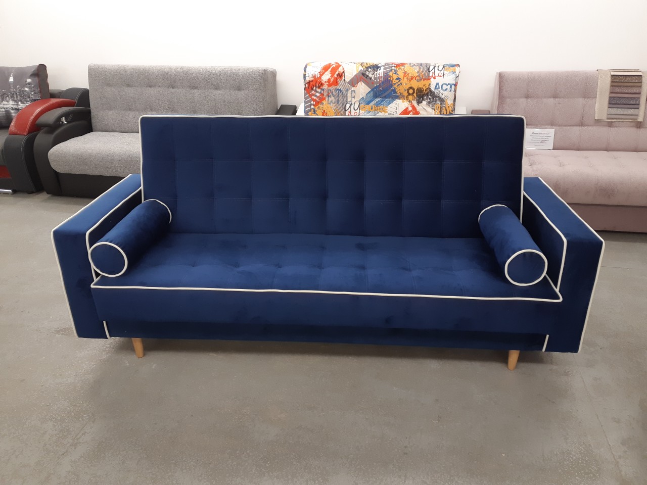 Механизм трансформации «еврокнижка» позволяет легко превратить диван в спальное место. Синяя обивка украшена белыми полосками.