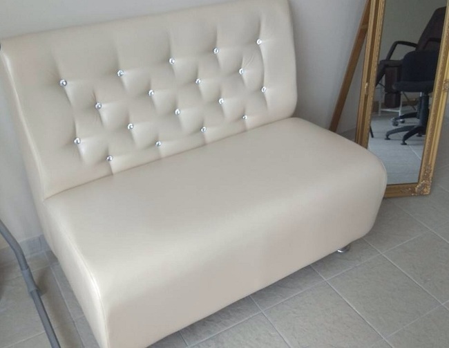 код 58772Диван в салоне красоты выполнен из искусственной кожи, декорирован стразами.
