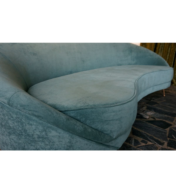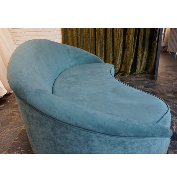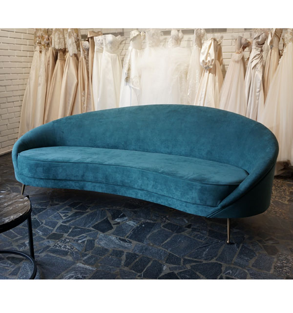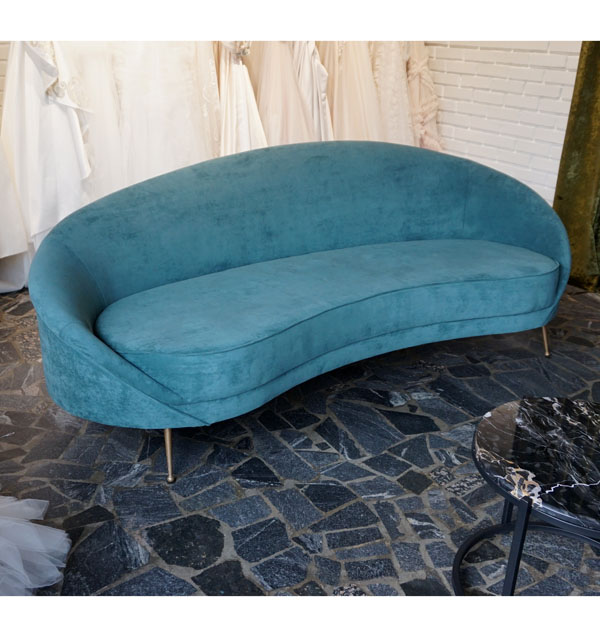 Полукруглый диванчик на тонких ножках под античную бронзу как будто парит в воздухе, а плавный комфортный наклон спинки в сторону мягкого эластичного сиденья делает похожим его на морскую ракушку. Бархатистая обивка насыщенного цвета приятная на ощупь и легко поддается чистке.