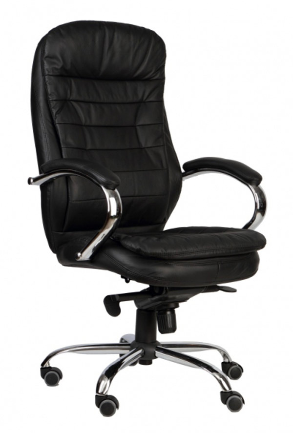 Офисное кресло «Империал LUX» выполнено из натуральной кожи. Черный цвет обивки навеет мысли о солидности и строгости хозяина. Для удобства, хромированные подлокотники снабжены мягкими накладками в цвет кресла. Функциональность обеспечит установленный механизм качения.