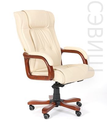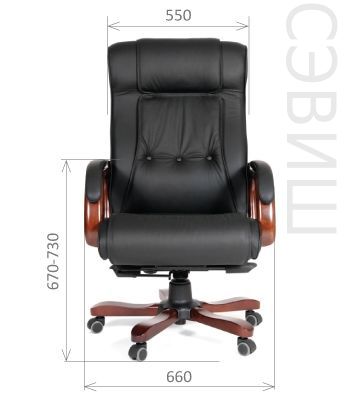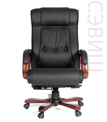 Роскошное офисное кресло с сиденьем и спинкой удобной ортопедической формы, повторяющей правильные очертания тела. Обивка - черная матовая экокожа с накладкой и тремя клепками. Полукруглые глянцевые полокотники светло-кориневого цвета в тонах ореха с мягкими накладками в тон общей расцветки.