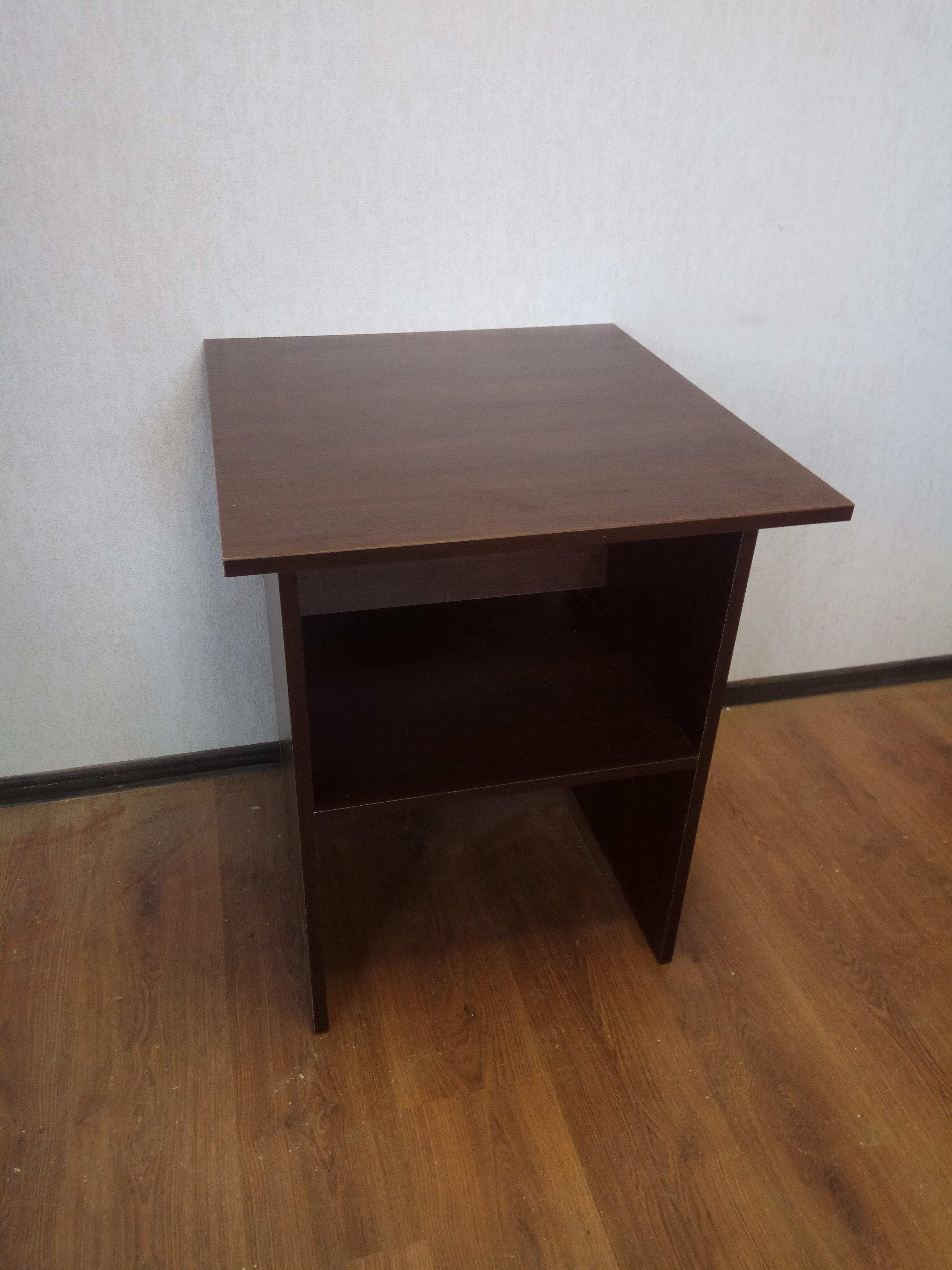 Столик-тумба для офиса приставного типа на неподвижной и прочной опоре. Расцветка под дерево венге, изготовлено из ДСП с ламинированием, что повышает долговечность и безопасность данной тумбы. Имеется одна несъемная полка для хранения документов.