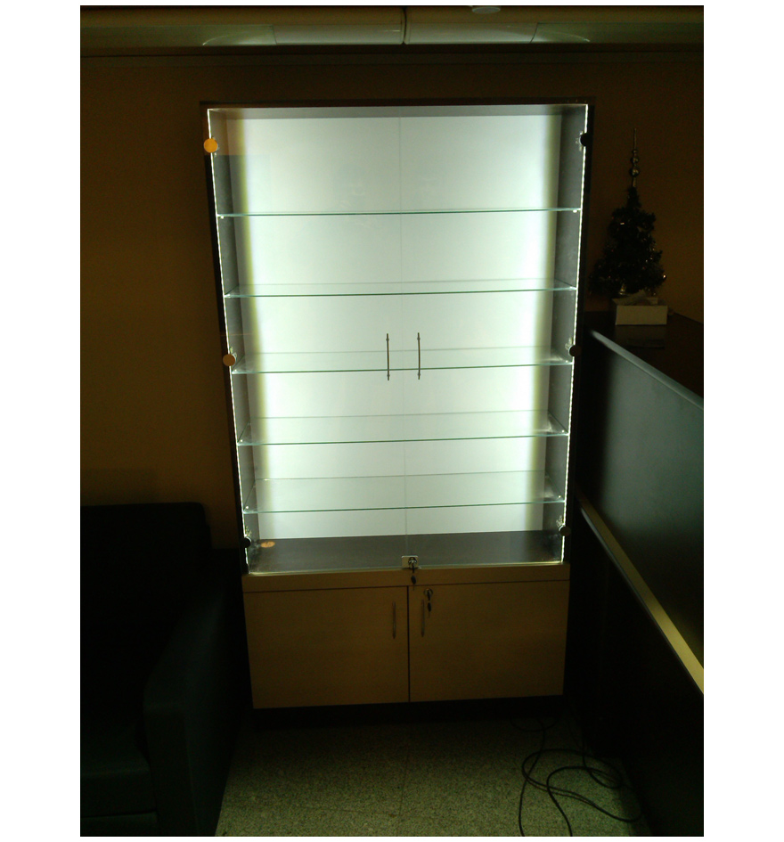Офисный шкаф делится на два отделения, которые комплектуются небольшими замками. Верхнее имеет стеклянный фасад и стеклянные полочки внутри. Нижнее отделение обладает меньшим объемом и предназначено для хранения мелких принадлежностей.
