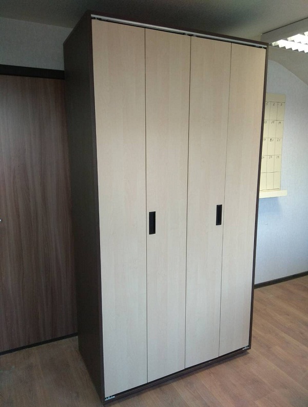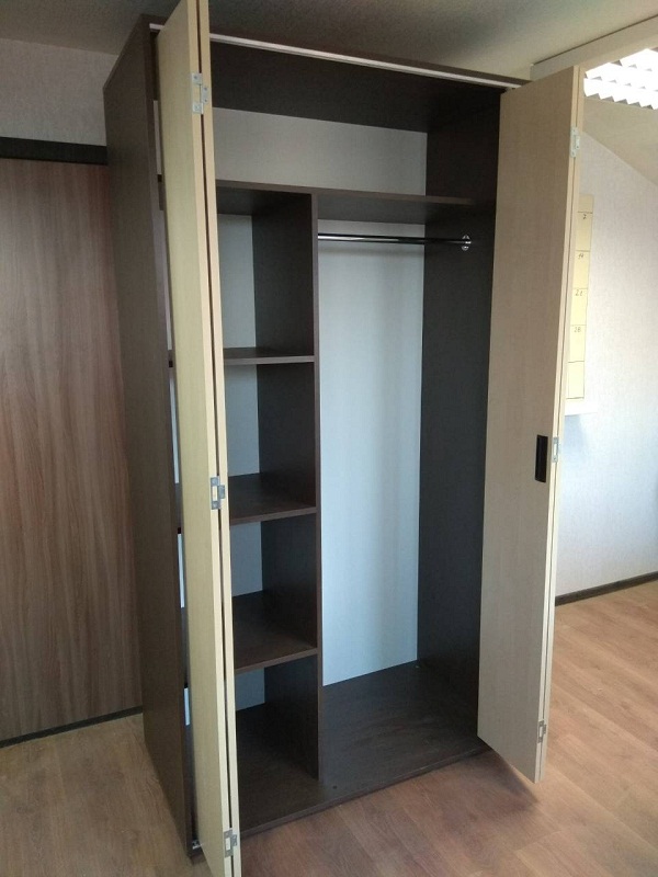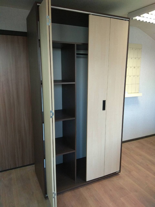 Двери по типу открытия - складные, гармошка. Внутри разделен на две половины: полки для одежды, штанга для одежды. Цвет: Венге, Берёза. Возможны другие варианты цветового исполнения.