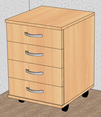 Тумба офисная подкатная изготовлена из ламинированной ДСП. Все видимые кромки облицованы лентой ПВХ. Направляющие выдвижных ящиков – шариковые полного выката. Цвет ДСП – бук бавария.