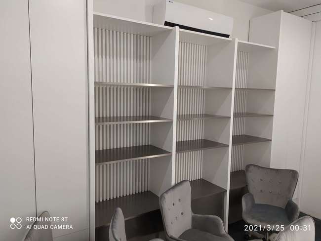 Современный комбинированный стеллаж с открытыми и закрытыми фасадами.